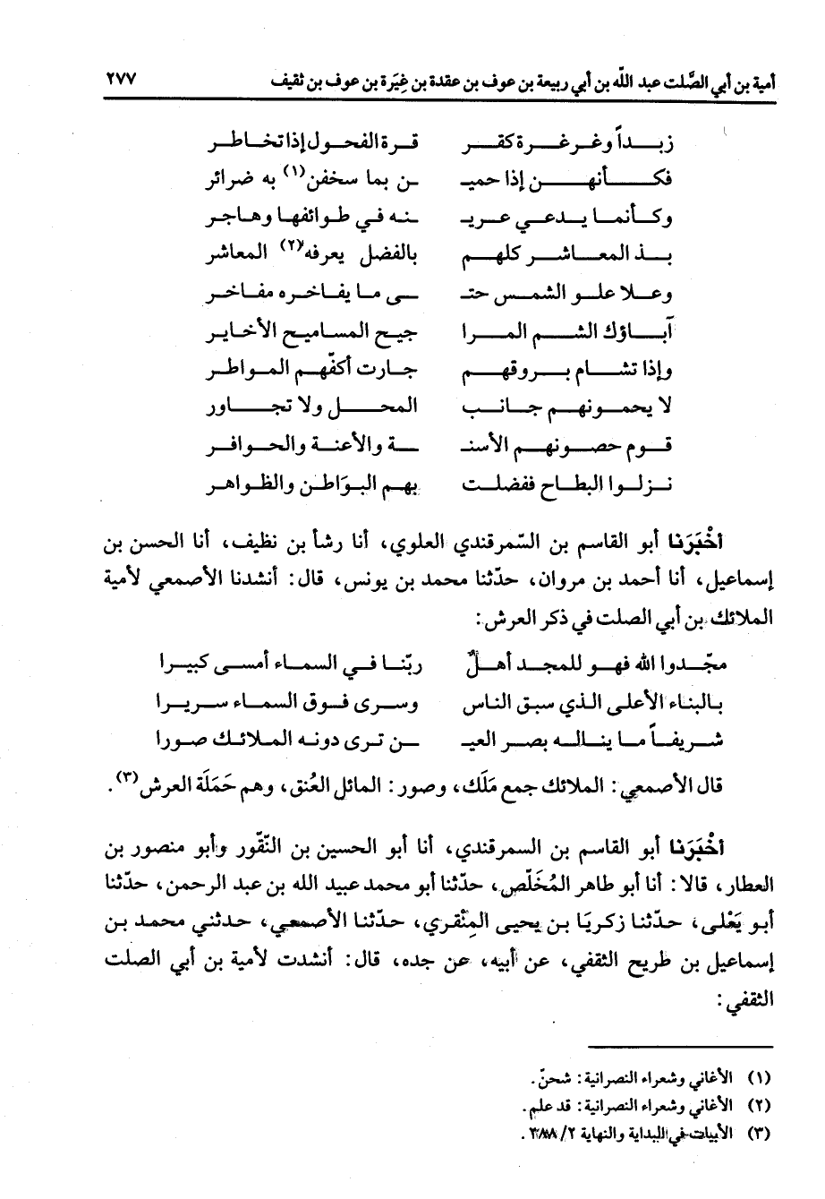 زبدا وغرغرة كقر * قرة الفخول إذا تخاطر فكأنهن إذا حمي * ن بما سخفن (1) به ضرائر وكأنما يدعى عري * نه في طوائفها وهاجر بذ المعاشر كلهم * بالفضل يعرفه (2) المعاشر وعلا علو الشمس حت * ى ما يفاخره مفاخر آباؤك الشم المرا * جيح المساميح الأخاير وإذا تشام بروقهم * جارت أكفهم المواطر لا يحمونهم جانب * المحل ولا تجاور قومهم حصونهم الأسن * ة والأعنة والحوافر نزلوا البطاح ففضلت * بهم البواطن والظواهر * أخبرنا أبو القاسم بن السمرقندي العلوي أنا رشأ بن نظيف أنا الحسن بن إسماعيل أنا أحمد بن مروان حدثنا محمد بن يونس قال أنشدنا الأصمعي لأمية الملائك بن أبي الصلت في ذكر العرش * مجدوا الله فهو للمجد أهل * ربنا في السماء أمسى كبيرا بالبناء الأعلى الذي سبق الناس * وسرى فوق السماء سريرا شريفا ما يناله بصر العي * ن ترى دونه الملائك صورا * قال الأصمعي الملائك جمع ملك وصور المائل العنق وهم حملة العرش (3) أخبرنا أبو القاسم بن السمرقندي أنا أبو الحسين بن النقور وأبو منصور بن العطار قالا أنا أبو طاهر المخلص حدثنا أبو محمد عبيد الله بن عبد الرحمن حدثنا أبو يعلى حدثنا زكريا بن يحيى المنقري حدثنا الأصمعي حدثني محمد بن إسماعيل بن طريح الثقفي عن أبيه عن جده قال أنشدت لأمية بن أبي الصلت الثقفي *