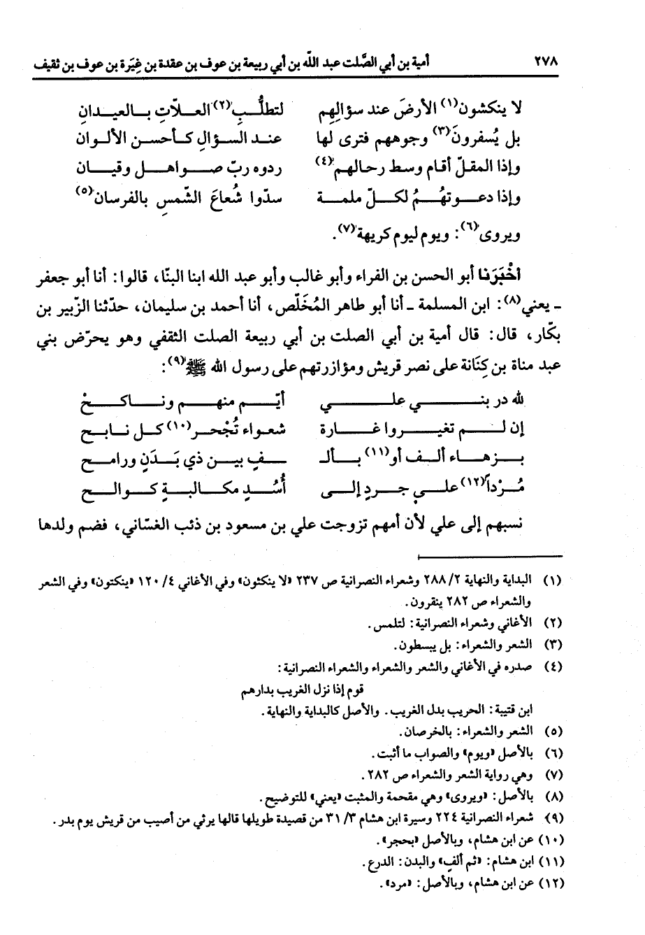 لا ينكشون (1) الأرض عند سؤالهم * لتطلب (2) العلات بالعيدان بل يسفرون (3) وجوههم فترى لها * عند السؤال كأحسن الألوان وإذا المقل أقام وسط رحالهم (4) * ردوه رب صواهل وقيان وإذا دعوتهم لكل ملمة * سدوا شعاع الشمس بالفرسان (5) * ويروى (6) ويوم ليوم كريهة (7) أخبرنا أبو الحسن بن الفراء وأبو غالب وأبو عبد الله ابنا البنا قالوا أنا أبو جعفر يعني (8) ابن المسلمة أنا أبو طاهر المخلص أنا أحمد بن سليمان حدثنا الزبير بن بكار قال قال أمية بن أبي الصلت بن أبي ربيعة الصلت الثقفي وهو يحرض بني عبد مناة بن كنانة على نصر قريش ومؤازرتهم على رسول الله (صلى الله عليه وسلم) (9) * لله در بني علي * أيم منهم وناكح إن لم تغيروا غارة * شعواء تجحر (10) كل نابح بزهاء ألف (11) أو بأل * ف بين ذي بدن ورامح مردا (12) على جرد إلى * أسد مكالبة كوالح * نسبهم إلى علي لأن أمهم تزوجت علي بن مسعود بن ذئب الغساني فضم ولدها
