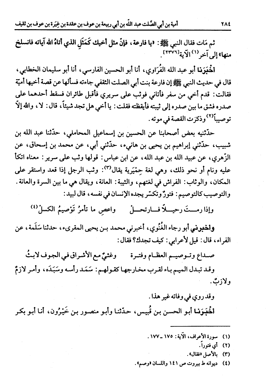 ثم مات فقال النبي (صلى الله عليه وسلم) يا فارعة فإن مثل أخيك كمثل الذي أتاه الله آياته فانسلخ منها إلى آخر الآية (1) أخبرنا أبو عبد الله الفراوي أنا أبو الحسين الفارسي أنا أبو سليمان الخطابي قال في حديث النبي (صلى الله عليه وسلم) إن فارعة بنت أبي الصلت الثقفي جاءته فسألها عن قصة أخيها أمية فقالت قدم أخي من سفر فأتاني فوثب على سريري فأقبل طائران فسقط أحدهما على صدره فشق ما بين صدره إلى ثيبته فأيقظته فقلت يا أخي هل تجد شيئا قال لا والله إلا توصيبا (2) وذكرت القصة في موته حدثنيه بعض أصحابنا عن الحسين بن إسماعيل المحاملي حدثنا عبد الله بن شبيب حدثني إبراهيم بن يحيى بن هانئ حدثني أبي عن محمد بن إسحاق عن الزهري عن عبيد الله بن عبد الله عن ابن عباس قولها وثب على سرير معناه اتكأ عليه ونام أو نحو ذلك وهي لغة حميرية يقال (3) وثب الرجل إذا قعد واستقر على المكان والوثاب الفراش في لغتهم والثيبة العانة ويقال هي ما بين السرة والعانة والتوصيب كالتوصيم فتور وتكسر يجده الإنسان في نفسه قال لبيد * وإذا رمت رحيلا فارتحل * واعص ما تأمر توصيكم الكسل (4) * وأخبرني أبو رجاء الغنوي أخبرني محمد بن يحيى المقرئ حدثنا سلمة عن الفراء قال قيل لأعرابي كيف تجدك فقال * صداع وتوصيم العظام وفترة * وغثي مع الإشراق في الجوف لابث * وقد تبدل الميم باء لقرب مخارجها كقولهم سمد وسبده وأمر لازم ولازب وقد روي في وفاته غير هذا أخبرنا أبو الحسن بن قبيس حدثنا وأبو منصور بن خيرون أنا أبو بكر