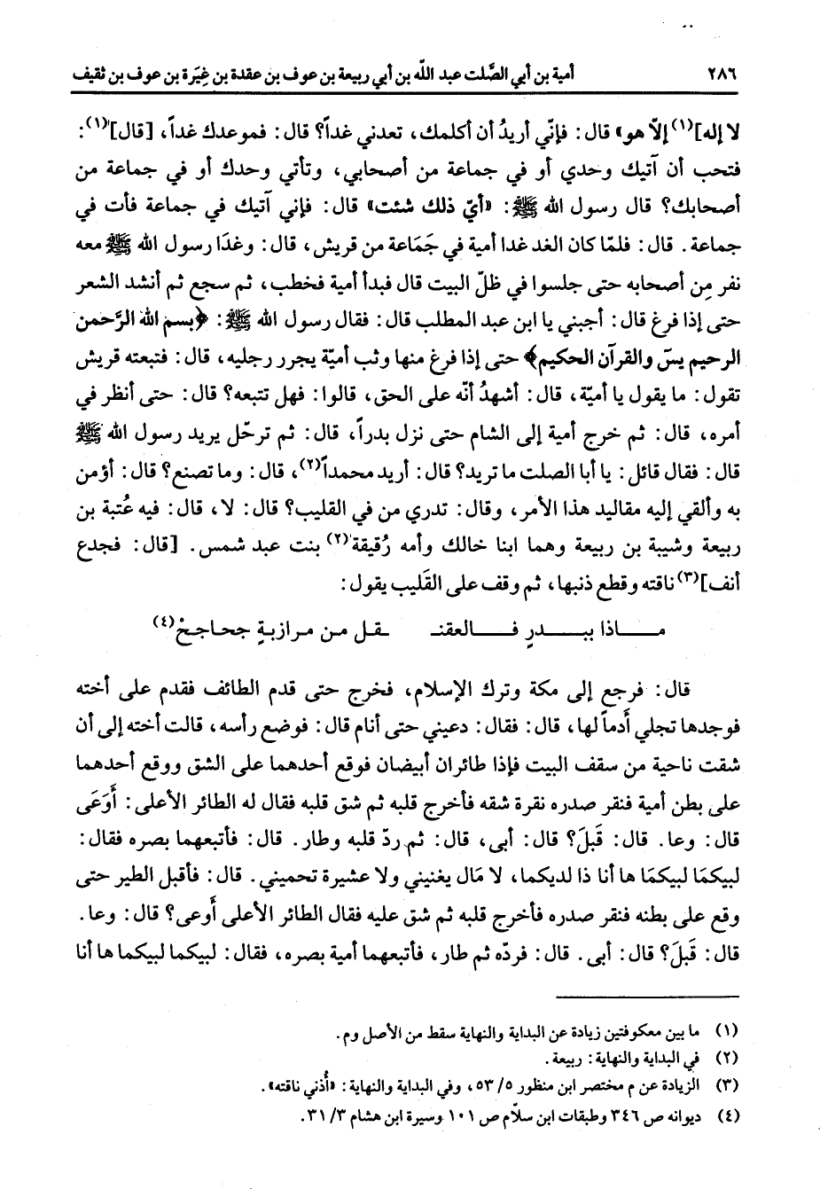 إله (1) إلا هو قال فإني أريد أن أكلمك تعدني غدا قال فموعدك غدا قال (1) فتحب أآتيك وحدي أو في جماعة من أصحابي وتأتي وحدك أو في جماعة من أصحابك قال رسول الله (صلى الله عليه وسلم) أي ذلك شئت قال فإني آتيك في جماعة فأت في جماعة قال فلما كان الغد غدا أمية في جماعة من قريش قال وغدا رسول الله (صلى الله عليه وسلم) معه نفر من أصحابه حتى جلسوا في ظل البيت قال فبدأ أمية فخطب ثم سجع ثم أنشد الشعر حتى إذا فرغ قال أجبني يا ابن عبد المطلب قال فقال رسول الله (صلى الله عليه وسلم) " بسم الله الرحمن الرحيم يس والقرآن الحكيم " حتى أذا فرغ منها وثب أمية يجرر رجليه قال فتبعته قريش تقول ما يقول يا أمية قال أشهد أنه على حق قالوا فهل تتبعه قال حتى أنظر في أمره قال ثم خرج أمية إلى الشام حتى نزل بدرا قال ثم ترحل يريد رسول الله (صلى الله عليه وسلم) قال فقال قائل يا أبا الصلت ما تريد قال أريد محمدا (2) قال وما تصنع قال أؤمن به وألقي إليه مقاليد هذا الأمر وقال تدري من في القليب قال لا قال فيه عتبة بن ربيعة وشيبة بن ربيعة وهما ابنا خالك وأمه رقيقة (2) بنت عبد شمس قال فجدع أنف (3) ناقته وقطع ذنبها ثم وقف على القليب يقول * ماذا ببدر فالعقن * قل من مرازبة جحاجح (4) * قال فرجع إلى مكة وترك الإسلام فخرج حتى قدم الطائف فقدم على أخته فوجدها تجلي أدما لها قال فقال دعيني حتى أنام قال فوضع رأسه قالت أخته إلى أن شقت ناحية من سقف البيت فإذا طائران أبيضان فوقع أحدهما على الشق ووقع أحدهما على بطن أمية فنقر صدره نقرة شقه فأخرج قلبه ثم شق قلبه فقال له الطائر الأعلى أوعى قال وعا قال قبل قال أبى قال ثم رد قلبه وطار قال فأتبعهما بصره فقال لبيكما لبيكما ها أنا ذا لديكما لا مال يعنيني ولا عشيرة تحميني قال فأقبل الطير حتى وقع على بطنه فنقر صدره فأخرج قلبه صم شق عليه فقال الطائر الأعلى أوعى قال وعا قال قبل قال أبى فرده صم طار فأتبعهما أمية بصره فقال لبيكما لبيكما ها أنا