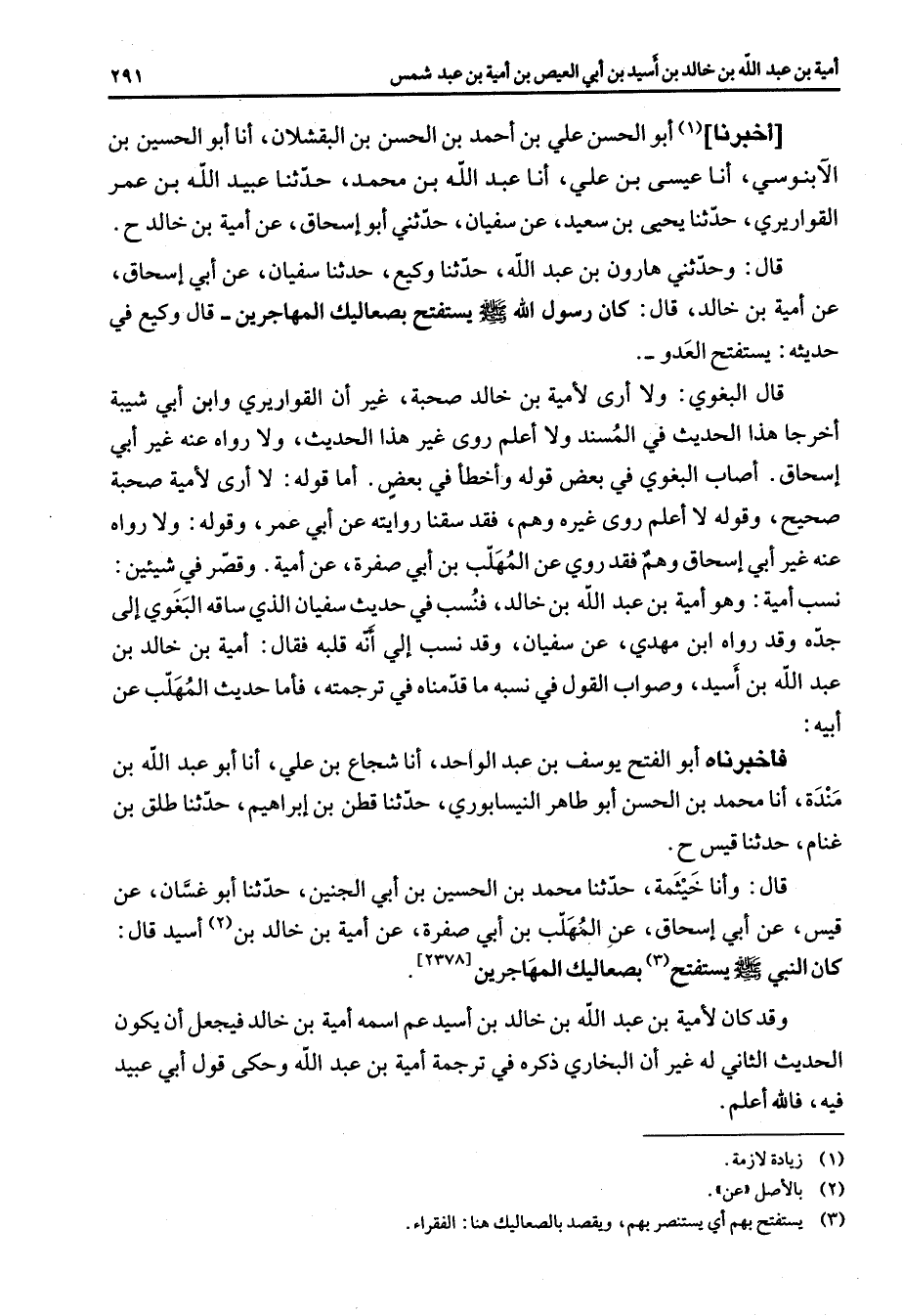 أخبرنا (1) أبو الحسن علي بن أحمد بن الحسن بن البقشلان أنا أبو الحسين بن الآبنوسي أنا عيسى بن علي أنا عبد الله بن محمد حدثنا عبيد الله بن عمر القواريري حدثنا يحيى بن سعيد عن سفيان حدثني أبو إسحاق عن أمية بن خالد ح قال وحدثني هارون بن عبد الله حدثنا وكيع حدثنا سفيان عن أبي إسحاق عن أمية بن خالد قال كان رسول الله (صلى الله عليه وسلم) يستفتح بصعاليك المهاجرين ح قال وكيع في حديثه يستفتح العدو قال البغوي ولا أرى لأمية بن خالد صحبة غير أن القواريري وابن أبي شيبة أخرجا هذا الحديث في المسند ولا أعلم روى غير هذا الحديث ولا رواه عنه غير أبي إسحاق أصاب البغوي في بعض قوله وأخطأ في بعض أما قوله لا أرى لأمية صحبة صحيح وقوله لا أعلم روى غيره وهم فقد سقنا روايته عن أبي عمر وقوله ولا رواه عنه غير أبي إسحاق وهم فقد روي عن المهلب بن أبي صفرة عن أمية وقصر في شيئين نسب أمية وهو أمية بن عبد الله بن خالد فنسب في حديث سفيان الذي ساقه البغوي إلى جده وقد رواه ابن مهدي عن سفيان وقد نسب إلي أنه قلبه فقال أمية بن خالد بن عبد الله بن أسيد وصواب القول في نسبه ما قدمناه في ترجمته فأما الحديث المهلب عن أبيه فأخبرناه أبو الفتح يوسف بن عبد الواحد أنا شجاع بن علي أنا أبو عبد الله بن مندة أنا محمد بن الحسن أبو طاهر النيسابوري حدثنا قطن بن إبراهيم حدثنا طلق بن غنام حدثنا قيس ح قال وأنا خيثمة حدثنا محمد بن الحسين بن أبي الجنين حدثنا أبو غسان عن قيس عن أبي إسحاق عن المهلب بن أبي صفرة عن أمية بن خالد بن (2) أسيد قال كان النبي (صلى الله عليه وسلم) يستفتح (3) بصعاليك المهاجرين وقد كان لأمية بن عبد الله بن خالد بن أسيد عم أسمه أمية بن خالد فيجعل أن يكون الحديث الثاني له غير أن البخاري ذكره في ترجمة أمية بن عبد الله وحكى قول أبي عبيد فيه فالله أعلم