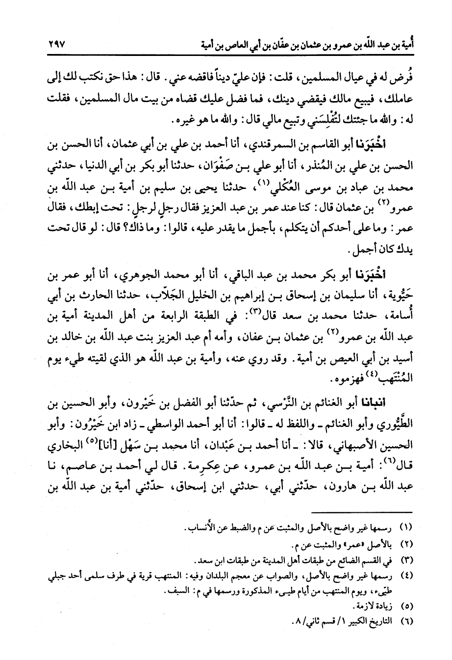 فرض له في عيال المسلمين قلت فإن علي دينا فاقضه عني قال هذا حق نكتب لك إلى عاملك فيبيع مالك فيقضي دينك فما فضل عليك قضاه من بيت مال المسلمين فقلت له والله ما جئتك لتفلسني وتبيع مالي قال والله ما هو غيره أخبرنا أبو القاسم بن السمرقندي أنا أحمد بن علي بن أبي عثمان أنا الحسن بن الحسن بن علي بن المنذر أنا أبو علي بن صفوان حدثنا أبو بكر بن أبي الدنيا حدثني محمد بن عباد بن موسى العكلي (1) حدثنا يحيى بن سليم بن أمية بن عبد الله بن عمرو (2) بن عثمان قال كنا عند عمر بن عبد العزيز فقال رجل لرجل تحت إبطك فقال عمر وما على أحدكم أن يتكلم بأجمل ما يقدر عليه قالوا وما ذاك قال لو قال تحت يدك كان أجمل أخبرنا أبو بكر محمد بن عبد الباقي أنا أبو محمد الجوهري أنا أبو عمر بن حيوية أنا سليمان بن إسحاق بن إبراهيم بن الخليل الجلاب حدثنا الحارث بن أبي أسامة حدثنا محمد بن سعد (3) قال في الطبقة الرابعة من أهل المدينة أمية بن عبد الله بن عمرو (2) بن عثمان بن عفان وأمه أم عبد العزيز بنت عبد الله بن خالد بن أسيد بن أبي العيص بن أمية وقد روي عنه وأمية بن عبد الله هو الذي لقيته طئ يوم المنتهب (4) فهزموه أنبأنا أبو الغنائم بن النرسي ثم حدثنا أبو الفضل بن خيرون وأبو الحسين بن الطيوري وأبو الغنائم واللفظ له قالوا أنا أبو أحمد الواسطي زاد ابن خيرون وأبو الحسين الأصبهاني قالا أنا أحمد بن عبدان أنا محمد بن سهل أنا (5) البخاري قال (6) أمية بن عبد الله بن عمرو عن عكرمة قال لي أحمد بن عاصم نا عبد الله بن هارون حدثني أبي حدثني ابن إسحاق حدثني أمية بن عبد الله بن