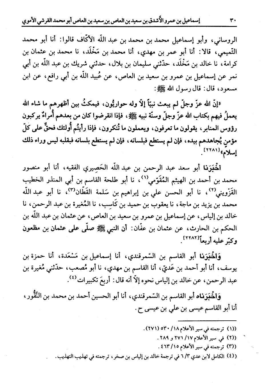 الروساني وأبو إسماعيل محمد بن محمد بن عبد الله الأكاف قالوا أنا أبو محمد التميمي قالا أنا أبو عمر بن مهدي أنا محمد بن مخلد نا محمد بن عثمان بن كرامة نا خالد بن مخلد حدثني سليمان بن بلال حدثني شريك بن عبد الله بن أبي نمر عن إسماعيل بن عمرو بن سعيد بن العاص عن عبيد الله بن أبي رافع عن أبن مسعود قال قال رسول الله (صلى الله عليه وسلم) إن الله عز وجل لم يبعث نبيا إلا وله حواريون فيمكث بين أظهرهم ما شاء الله يعمل فيهم بكتاب الله عز وجل وسنة نبيه (صلى الله عليه وسلم) فإذا انقرضوا كان من بعدهم أمراء يركبون رؤوس المنابر يقولون ما تعرفون ويعملون ما تنكرون فإذا رأيتم أولئك فحق على كل مؤمن يجاهدهم بيده فإن لم يستطع فبلسانه فإن لم يستطع بلسانه فبقلبه ليس وراء ذلك إسلام أخبرنا أبو سعد عبد الرحمن بن عبد الله الحصيري الفقيه أنا أبو منصور محمد بن أحمد بن الهيثم المقومي (1) نا أبو طلحة القاسم بن أبي المنذر الخطيب القزويني (2) نا أبو الحسن علي بن إبراهيم بن سلمة القطان (3) نا أبو عبد الله محمد بن يزيد بن ماجة نا يعقوب بن حميد بن كاسب نا الغيرة بن عبد الرحمن نا خالد بن إلياس عن إسماعيل بن عمرو بن سعيد بن العاص عن عثمان بن عبد الله بن الحكم بن الحارث عن عثمان بن عفان أن النبي (صلى الله عليه وسلم) صلى على عثمان بن مظعون وكبر عليه أربعا وأخبرنا أبو القاسم بن السمرقندي أنا إسماعيل بن مسعدة أنا حمزة بن يوسف أنا أبو أحمد بن عدي أنا القاسم بن مهدي نا أبو مصعب حدثني مغيرة بن عبد الرحمن عن خالد بن إلياس نحوه إلا أنه قال أربع تكبيرات (4) وأخبرناه أبو القاسم بن السمرقندي أنا أبو الحسين أحمد بن محمد بن النقور أنا أبو القاسم عيسى بن علي بن عيسى