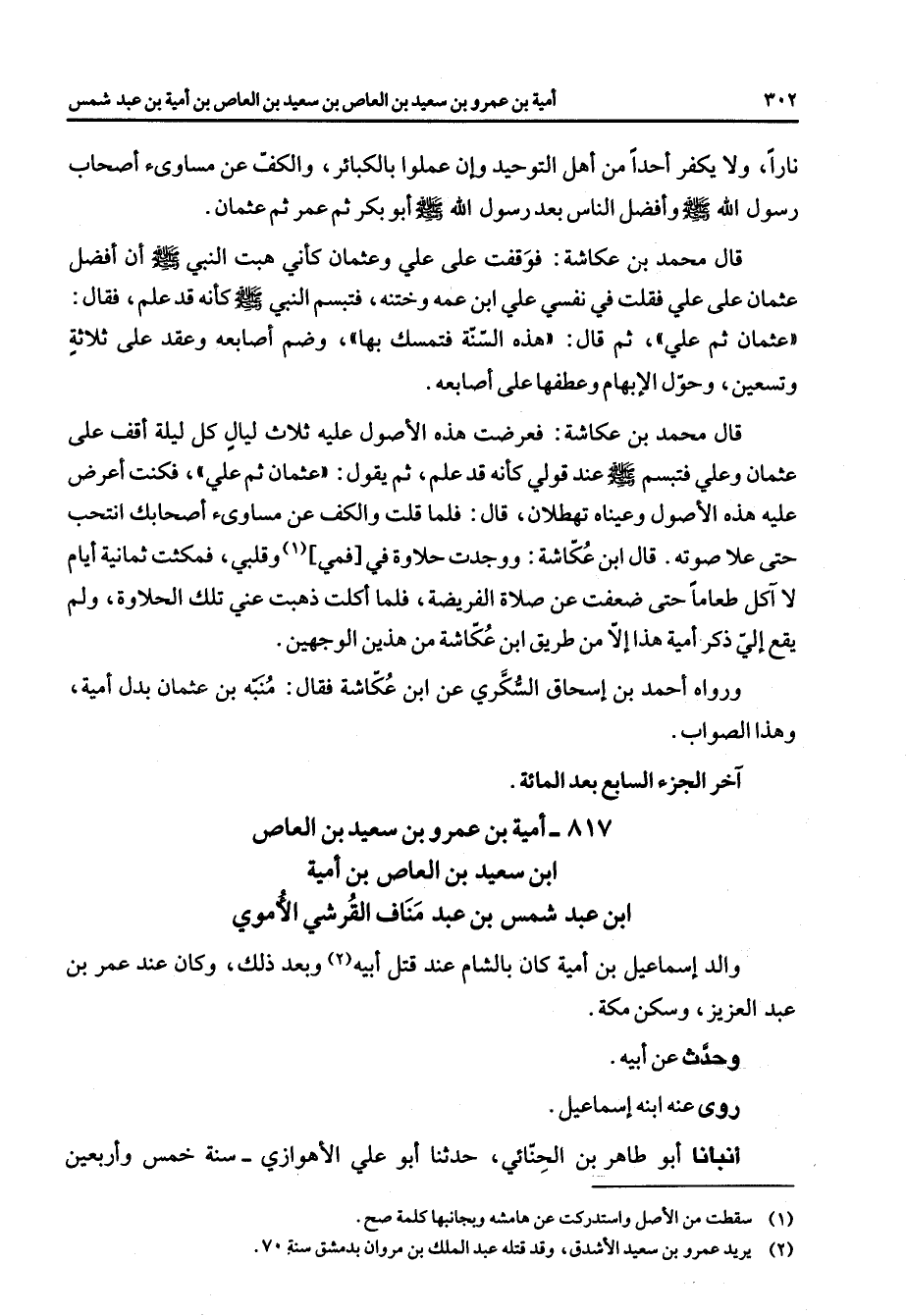 نارا ولا يكفر أحدا من أهل التوحيد وإن عملوا بالكبائر والكف عن مساوئ أصحاب رسول الله (صلى الله عليه وسلم) وأفضل الناس بعد رسول الله (صلى الله عليه وسلم) أبو بكر ثم عمر ثم عثمان قال محمد بن عكاشة فوقفت على علي وعثمان كأني هبت النبي (صلى الله عليه وسلم) أن أفضل عثمان على علي فقلت في نفسي علي ابن عمه وختنه فتبسم النبي (صلى الله عليه وسلم) كأنه قد علم فقال عثمان ثم علي ثم قال هذه السنة فتمسك بها وضم أصابعه وعقد على ثلاثة وتسعين وحول الإبهام وعطفها على أصابعه قال محمد بن عكاشة فعرضت هذه الأصول عليه ثلاث ليال كل ليلة أقف على عثمان وعلي فتبسم (صلى الله عليه وسلم) عند قولي كأنه قد علم ثم يقول عثمان ثم علي فكنت أعرض عليه هذه الأصول وعيناه تهطلان قال فلما قلت والكف عن مساوئ أصحابك انتحب حتى علا صوته قال ابن عكاشة ووجدت حلاوة في فمي (1) وقلبي فمكثت ثمانية أيام لا آكل طعاما حتى ضعفت عن صلاة الفريضة فلما أكلت ذهبت عني تلك الحلاوة ولم يقع إلي ذكر أمية هذا إلا من طريق ابن عكاشة من هذين الوجهين ورواه أحمد بن إسحاق السكري عن ابن عكاشة فقال منبه بن عثمان بدل أمية وهذا الصواب آخر الجزء السابع بعد المائة