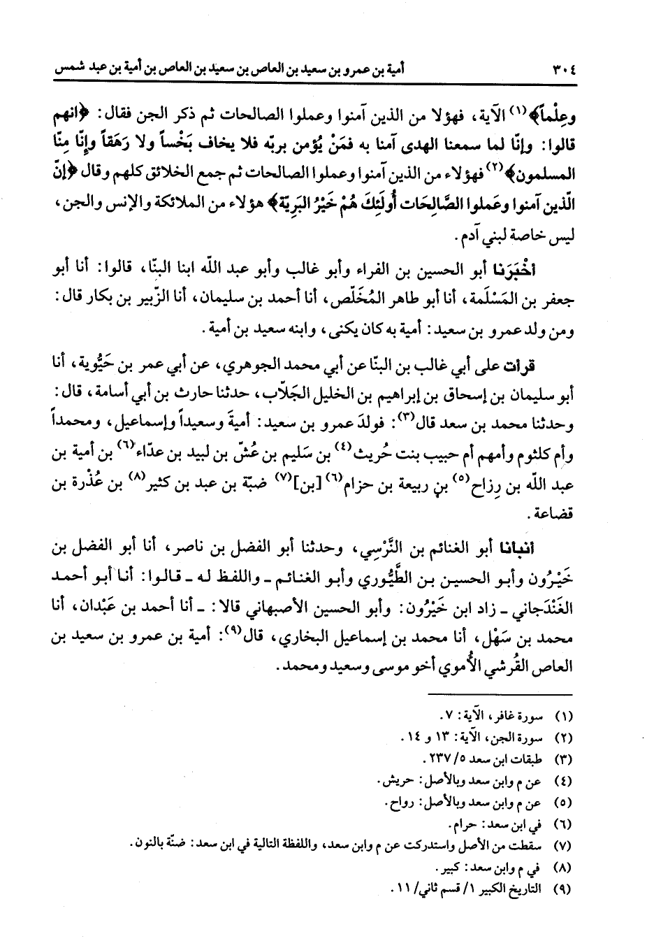 وعلما " (1) الآية فهؤلاء من الذين آمنوا وعملوا الصالحات ثم ذكر الجن فقال " إنهم قالوا وإناالما سمعنا الهدى آمنا به فمن يؤمن بربه فلا يخاف بخسا ولا رهقا وإنا ومنا المسلمون " (2) فهؤلاء من الذين آمنوا وعملوا الصالحات ثم جمع الخلائق كلهم وقال " إن الذين آمنوا وعملوا الصالحات أولئك هم خير البرية " هؤلاء من الملائكة والإنس والجن ليس خاصة ببني آدم أخبرنا أبو الحسين بن الفراء وأبو غالب وأبو عبد الله ابنا البنا قالوا أنا أبو جعفر بن المسلمة أنا أبو طاهر المخلص أنا أحمد بن سليمان أنا الزبير بن بكار قال ومن ولد عمرو بن سعيد أمية به كان يكنى وابنه سعيد بن أمية قرأت على أبي غالب بن البنا عن أبي محمد الجوهري عن أبي عمر بن حيوية أنا أبو سليمان بن إسحاق بن إبراهيم بن الخليل الجلاب حدثنا حارث بن أبي أسامة قال وحدثنا محمد بن سعد (3) قال فولد عمرو بن سعيد أمية وسعيدا وإسماعيل ومحمدا وأم كلثوم وأمهم أم حبيب بنت حريث (4) بن سليم بن عش بن لبيد بن عداء (6) بن أمية بن عبد الله بن رزاح (5) بن ربيعة بن حزام (6) بن (7) ضبة بن عبد بن كثير (8) بن عذرة بن قضاعة أنبأنا أبو الغنائم بن النرسي وحدثنا أبو الفضل بن ناصر أنا أبا الفضل بن خيرون وأبو الحسين بن الطيوري وأبو الغنائم واللفظ له قالوا أنا أبو أحمد الغندجاني زاد ابن خيرون وأبو الحسين الأصبهاني قالا أنا أحمد بن عبدان أنا