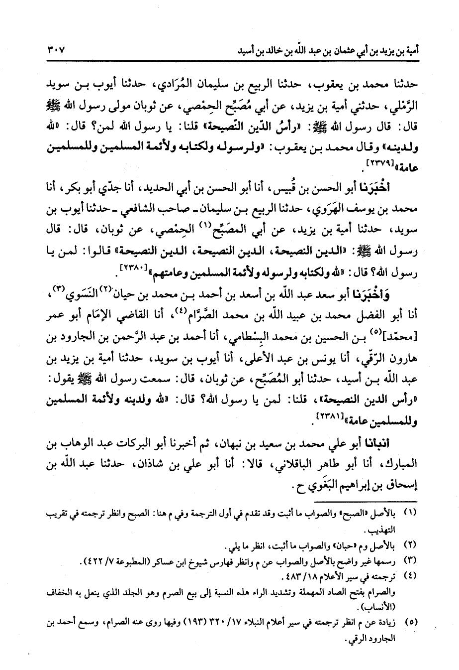 حدثنا محمد بن يعقوب حدثنا الربيع بن سليمان المرادي حدثنا أيوب بن سويد الرملي حدثني أمية بن يزيد عن أبي مصبح الحمصي عن ثوبان مولى رسول الله (صلى الله عليه وسلم) قال قال رسول الله (صلى الله عليه وسلم) رأس الدين النصيحة قلنا يا رسول الله لمن قال لله ولدينه وقال محمد بن يعقوب ولرسوله ولكتابه ولأئمة المسلمين وللمسلمين عامة أخبرنا أبو الحسن بن قبيس أنا أبو الحسن بن أبي الحديد أنا جدي أبو بكر أنا محمد بن يوسف الهروي حدثنا الربيع بن سليمان صاحب الشافعي حدثنا ايوب بن سويد حدثنا أمية بن يزيد عن أبي المصبح (1) الحمصي عن ثوبان قال قال رسول الله (صلى الله عليه وسلم) الدين النصيحة الدين النصيحة الدين النصيحة قالوا لمن يا رسول الله قال لله ولكتاب ولرسوله ولأئمة المسلمين وعامتهم وأخبرنا أبو سعد عبد الله بن أسعد بن أحمد بن محمد بن حيان (2) النسوي (3) أنا أبو الفضل محمد بن عبيد الله بن محمد الصرام (4) أنا القاضي الإمام أبو عمر محمد (5) بن الحسين بن محمد البسطامي أنا أحمد بن عبد الرحمن بن الجارود بن هارون الرقي أنا يونس بن عبد الأعلى أنا أيوب بن سويد حدثنا أمية بن يزيد بن عبد الله بن أسيد حدثنا أبو المصبح عن ثوبان قال سمعت رسول الله (صلى الله عليه وسلم) يقول رأس الدين النصيحة قلنا لمن يا رسول الله قال لله ولدينه ولأئمة المسلمين وللمسلمين عامة أنبأنا أبو علي محمد بن سعيد بن نبهان ثم أخبرنا أبو البركات عبد الوهاب بن المبارك أنا أبو طاهر الباقلاني قالا أنا أبو علي بن شاذان حدثنا عبد الله بن إسحاق بن إبراهيم البغوي ح