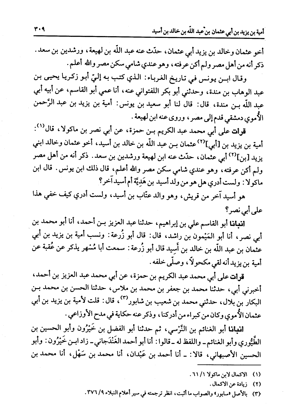أخو عثمان وخالد بن يزيد أبي عثمان حدث عنه عبد الله بن لهيعة ورشدين بن سعد ذكر أنه من أهل مصر ولم أكن عرفته وهو عندي شامي سكن مصر والله أعلم وقال ابن يونس في تاريخ الغرباء الذي كتب به إلي أبو زكريا يحيى بن عبد الوهاب بن مندة وحدثني أبو بكر اللفتواني عنه أنا عمي أبو القاسم عن أبيه أبي عبد الله بن مندة قال قال لنا أبو سعيد بن يونس أمية بن يزيد بن عبد الرحمن الأموي دمشقي قدم إلى مصر وروى عنه ابن لهيعة قرأت على أبي محمد عبد الكريم بن حمزة عن أبي نصر بن ماكولا قال (1) أمية بن يزيد بن أبي عثمان بن عبد الله بن خالد بن أسيد أخو عثمان وخالد ابني يزيد بن (2) أبي عثمان حدث عنه ابن لهيعة ورشدين بن سعد ذكر أنه من أهل مصر ولم أكن عرفته وهو عندي شامي سكن مصر والله أعلم قال ذلك ابن يونس قال ابن ماكولا ولست أدري هل هو من ولد أسيد بن هدية أم أسيد آخر هو أسيد آخر من قريش وهو والد عتاب بن أسيد ولست أدري كيف خفي هذا على أبي نصر أنبأنا أبو القاسم علي بن إبراهيم حدثنا عبد العزيز بن أحمد أنا أبو محمد بن أبي نصر أنا أبو الميمون بن راشد قال قال أبو زرعة ونسب أمية بن يزيد بن أبي عثمان بن عبد الله بن خالد بن أسيد قال أبو زرعة سمعت أبا مسهر يذكر عن عقبة عن أمية بن يزيد أنه لقي مكحولا وصلى خلفه قرأت على أبي محمد عبد الكريم بن حمزة عن أبي محمد عبد العزيز بن أحمد أخبرني أبي حدثنا محمد بن جعفر بن محمد بن ملاس حدثنا الحسن بن محمد بن البكار بن بلال حدثني محمد بن شعيب بن شابور (3) قال قلت لأمية بن يزيد بن أبي عثمان الأموي وكان من كبراء من أدركنا وذكر عنه حكاية في مدح الأوزاعي أنبأنا أبو الغنائم بن النرسي ثم حدثنا أبو الفضل بن خيرون وأبو الحسين بن الطيوري وأبو الغنائم واللفظ له قالوا أنا أبو أحمد الغندجاني زاد ابن خيرون وأبو الحسين الأصبهاني قالا أنا أحمد بن عبدان أنا محمد بن سهل أنا محمد بن