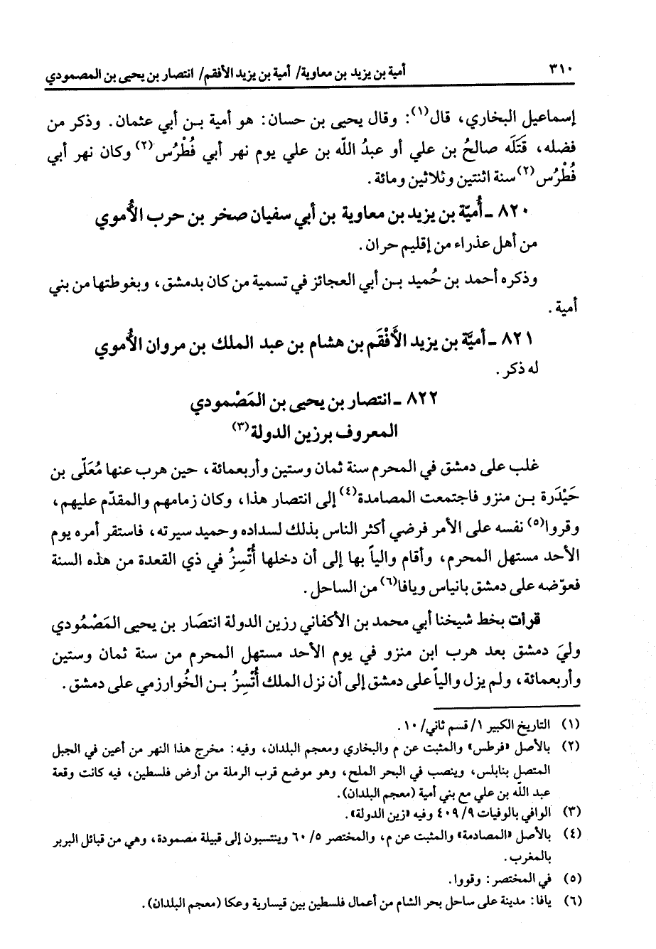 822 - انتصار بن يحيى بن المصمودي المعروف برزين الدولة (3) غلب على دمشق في المحرم سنة ثمان وستين وأربعمائة حين هرب عنه معلى بن حيدرة بن منزو فاجتمعت المصامدة (4) إلى انتصار هذا وكان زمامهم والمقدم عليهم وقروا (5) نفسه على الأمر فرضي أكثر الناس بذلك لسداده وحميد سيرته فاستقر أمره يوم الأحد مستهل المحرم وأقام واليا بها إلى أن دخلها أتسز في ذي القعدة من هذه السنة فعوضه على دمشق بانياس ويافا من الساحل (6) قرأت بخط شيخنا أبي محمد بن الأكفاني رزين الدولة انتصار بن يحيى المصمودي ولي دمشق بعد هرب ابن منزو في يوم الأحد مستهل المحرم من سنة ثمان وستين وأربعمائة ولم يزل واليا على دمشق إلى أن نزل الملك أتسز بن الخوارزمي على دمشق "