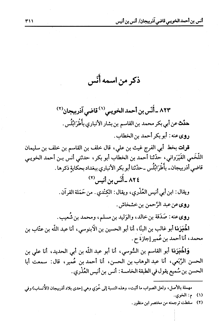 ذكر من اسمه أنس " 823 أنس بن أحمد الخويي (1) قاضي آذربيجان (2) حدث عن أبي بكر محمد بن القاسم بن بشار الأنباري بأطرابلس روى عنه أبو بكر أحمد بن الخطاب قرأت بخط أبي الفرج غيث بن علي قال خلف بن القاسم بن خلف بن سليمان اللخمي القيرواني حدثنا أحمد بن الخطاب أبو بكر حدثني أنس بن أحمد الخويي قاضي أذربيجان بأطرابلس حدثنا أبو بكر الأنباري ببغداد بحكاية ذكرها