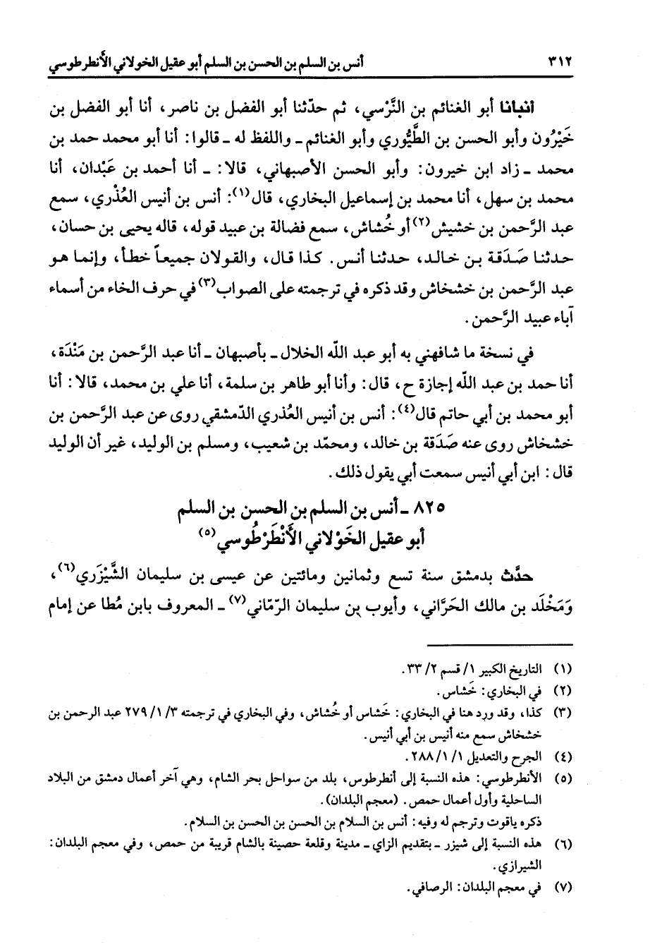 825 - أنس بن السلم بن الحسن بن السلم أبو عقيل الخولاني الأنطرطوسي (5) حدث بدمشق سنة تسع وثمانين ومائتين عن عيسى بن سليمان الشيزري (6) ومخلد بن مالك الحراني وأيوب بن سليمان الرماني (7) المعروف بابن مطاعن إمام