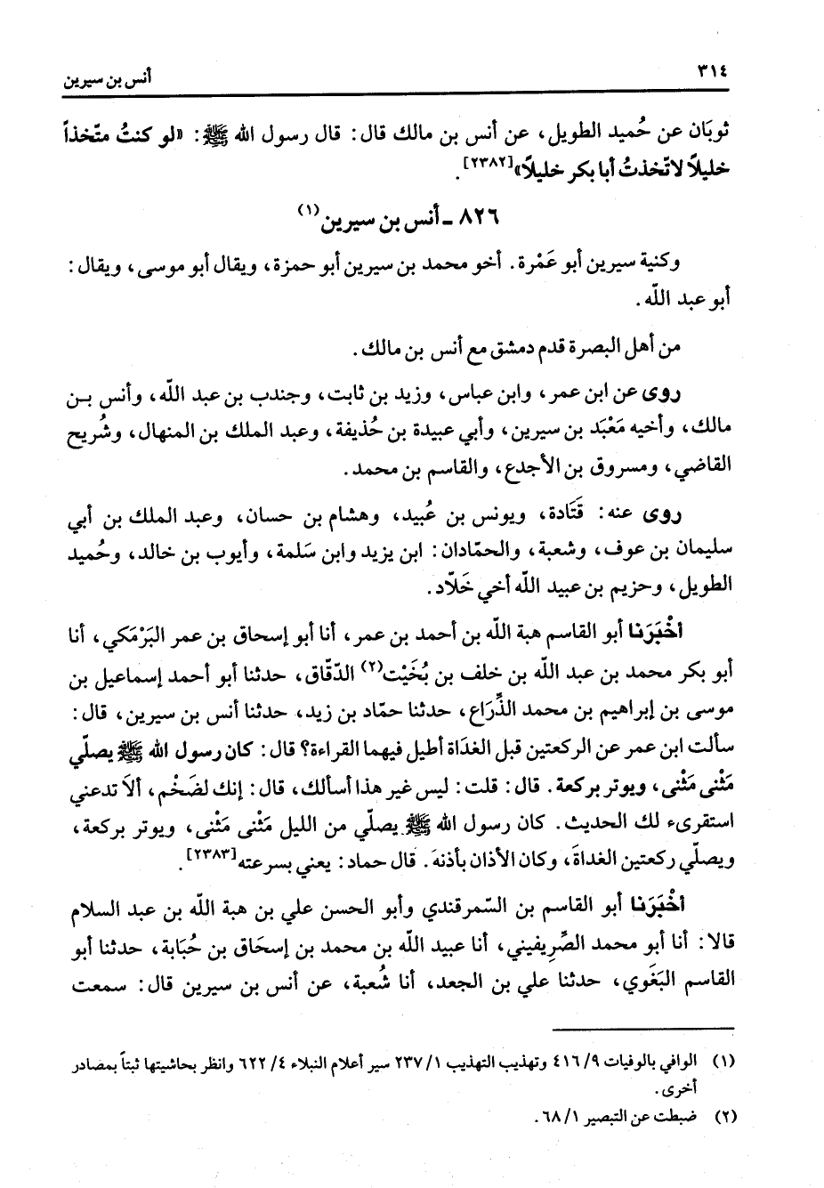 826 - أنس بن سيرين (1) وكنية سيرين أبو عمرة أخو محمد بن سيرين أبو حمزة ويقال أبو موسى ويقال أبو عبد الله من أهل البصرة قدم دمشق مع أنس بن مالك روى عن ابن عمر وابن عباس وزيد بن ثابت وجندب بن عبد الله وأنس بن مالك وأخيه معبد بن سيرين وأبي عبيدة بن حذيفة وعبد الملك بن المنهال وشريح القاضي ومسروق بن الأجدع والقاسم بن محمد روى عنه قتادة ويونس بن عبيد وهشام بن حسان وعبد الملك بن أبي سليمان بن عوف وشعبة والحمادان ابن يزيد وابن سلمة وأيوب بن خالد وحميد الطويل وحزيم بن عبيد الله أخي خلاد أخبرنا أبو القاسم هبة الله بن أحمد بن عمر أنا أبو إسحاق بن عمر البرمكي أنا أبو بكر محمد بن عبد الله بن خلف بن بخيت (2) الدقاق حدثنا أبو أحمد إسماعيل بن موسى بن إبراهيم بن محمد الذراع حدثنا حماد بن زيد حدثنا أنس بن سيرين قال سألت ابن عمر عن الركعتين قبل الغداة أطيل فيهما القراءة قال كان رسول الله (صلى الله عليه وسلم) يصلي مثنى مثنى ويوتر بركعة قال قلت ليس غير هذا أسألك قال إنك لضخم ألا تدعني استقرئ لك الحديث كان رسول الله (صلى الله عليه وسلم) يصلي من الليل مثنى مثنى ويوتر بركعة ويصلي ركعتين الغداة وكان الأذان بأذنه قال حماد يعني بسرعته أخبرنا أبو القاسم بن السمرقندي وأبو الحسن علي بن هبة الله بن عبد السلام قالا أنا أبو محمد الصريفيني أنا عبيد الله بن محمد بن إسحاق بن حبابة حدثنا أبو القاسم البغوي حدثنا علي بن الجعد أنا شعبة عن أنس بن سيرين قال سمعت