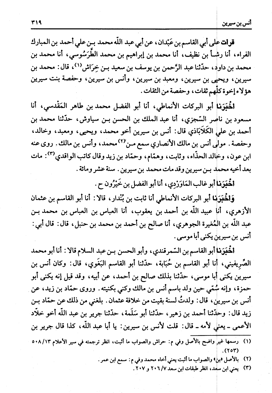 قرأت على أبي القاسم بن عبدان عن أبي عبد الله محمد بن علي أحمد بن المبارك الفراء أنا رشأ بن نظيف أنا محمد بن إبراهيم بن محمد الطرسوسي أنا محمد بن محمد بن داود وحدثنا عبد الرحمن بن يوسف بن سعيد بن خراش (1) قال محمد بن سيرين ويحيى بن سيرين ومعبد بن سيرين وأنس بن سيرين وحفصة بنت سيرين هؤلاء إخوة كلهم ثقات وحفصة من الثقات أخبرنا أبو البركات الأنماطي أنا أبو الفضل محمد بن طاهر المقدسي أنا مسعود بن ناصر السجزي أنا عبد الملك بن الحسن بن سياوش حدثنا محمد بن أحمد بن علي الكلاباذي قال أنس بن سيرين أخو محمد ويحيى ومعبد وخالد وحفصة مولى أنس بن مالك الأنصاري سمع من (2) محمد وأنس بن مالك روى عنه ابن عون وخالد الحذاء وثابت وهمام وحماد بن زيد وقال كاتب الواقدي (3) مات بعد أخيه محمد بن سيرين وقد مات محمد بن سيرين سنة عشر ومائة أخبرنا أبو غالب الماوردي أنا أبو الفضل بن خيرون ح واخبرنا أبو البركات الأنماطي أنا ثابت بن بندار قالا أنا أبو القاسم بن عثمان الأزهري أنا عبيد الله بن أحمد بن يعقوب أنا العباس بن العباس بن محمد بن عبد الله بن المغيرة الجوهري أنا صالح بن أحمد بن محمد بن حنبل قال قال أبي أنس بن سيرين يكنى أبا موسى أخبرنا أبو القاسم بن السمرقندي وأبو الحسن بن عبد السلام قالا أنا أبو محمد الصريفيني أنا أبو القاسم بن حبابة حدثنا أبو القاسم البغوي قال وكان أنس بن سيرين يكنى أبا موسى حدثنا بذلك صالح بن أحمد عن أبيه وقد قيل إنه يكنى أبو حمزة وإنه سمي حين ولد باسم أنس بن مالك وكنى بكنيته وروى حماد بن زيد عن أنس بن سيرين قال ولدت لسنة بقيت من خلافة عثمان بلغني من ذلك عن حماد بن زيد قال وحدثنا أحمد بن زهير حدثنا أبو سلمة حدثنا جرير بن عبد الله أخو خلاد الأعمى يعني لأمه قال قلت لأنس بن سيرين يا أبا عبد الله كذا قال جرير بن