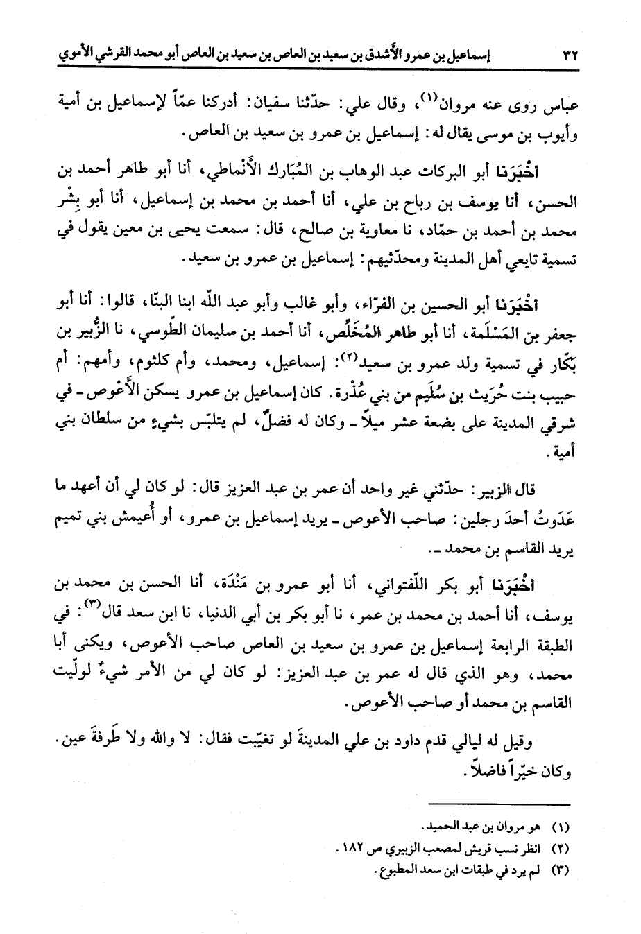 عباس روى عنه مروان (1) وقال علي حدثنا سفيان أدركنا عما لإسماعيل بن أمية وأيوب بن موسى يقال له إسماعيل بن عمرو بن سعيد بن العاص أخبرنا أبو البركات عبد الوهاب بن المبارك الأنماطي أنا أبو طاهر أحمد بن الحسن أنا يوسف بن رباح بن علي أنا أحمد بن محمد بن إسماعيل أنا أبو بشر محمد بن أحمد بن حماد نا معاوية بن صالح قال سمعت يحيى بن معين يقول في تسمية تابعي أهل المدينة ومحدثيهم إسماعيل بن عمرو بن سعيد أخبرنا أبو الحسين بن الفراء وأبو غالب وأبو عبد الله ابنا البنا قالوا أنا أبو جعفر بن المسلمة أنا أبو طاهر المخلص أنا أحمد بن سليمان الطوسي نا الزبير بن بكار في تسمية ولد عمرو بن سعيد (2) إسماعيل ومحمد وأم كلثوم وأمهم أم حبيب بنت حريث بن سليم من بني عذرة كان إسماعيل بن عمرو يسكن الأعوص في شرقي المدينة على بضعة عشر ميلا وكان له فضل لم يتلبس بشئ من سلطان بني أمية قال الزبير حدثني غير واحد أن عمر بن عبد العزيز قال لو كان لي أن أعهد ما عدوت أحد رجلين صاحب الأعوص يريد إسماعيل بن عمرو أو أعيمش بني تميم يريد القاسم بن محمد أخبرنا أبو بكر اللفتواني أنا أبو عمرو بن مندة أنا الحسن بن محمد بن يوسف أنا أحمد بن محمد بن عمر نا أبو بكر بن أبي الدنيا ابن سعد قال (3) : في الطبقة الرابعة إسماعيل بن عمرو بن سعيد بن العاص صاحب الأعوص ويكنى أبا محمد وهو الذي قال له عمر بن عبد العزبز لو كان لي من الأمر شئ لوليت القاسم بن محمد أو صاحب الأعوص وقيل له ليالي قدم داود بن علي المدينة لو تغيبت فقال لا والله ولا طرفة عين وكان خيرا فاضلا