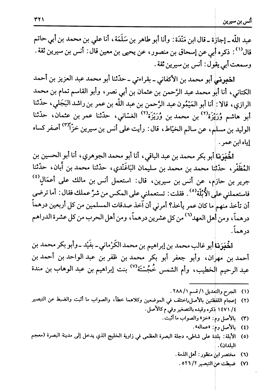 عبد الله إجازة قال ابن مندة وأنا أبو طاهر بن سلمة أنا علي بن محمد بن أبي حاتم قال (1) ذكره أبي عن إسحاق بن منصور عن يحيى بن معين قال أنس بن سيرين ثقة وسمعت أبي يقول أنس بن سيرين ثقة أخبرني أبو محمد بن الأكفاني بقراءتي حدثنا أبو محمد عبد العزيز بن أحمد الكتاني أنا أبو محمد عبد الرحمن بن عثمان بن أبي نصر وأبو القاسم تمام بن محمد الرازي قالا أنا أبو الميمون عبد الرحمن بن عبد الله بن عمر بن راشد البجلي حدثنا أبو هاشم وريزة (2) بن محمد بن وريزة (2) الغساني حدثنا عمر بن عثمان حدثنا الوليد بن مسلم عن سالم الخياط قال رأيت على أنس بن سيرين خزا (3) أصفر كساه إياه ابن عمر أخبرنا أبو بكر محمد بن عبد الباقي أنا أبو محمد الجوهري أنا أبو الحسين بن المظفر حدثنا محمد بن محمد بن سليمان الباغندي حدثنا محمد بن أبان حدثنا جرير بن حازم عن أنس بن سيرين قال استعمل أنس بن مالك على أعمال (4) فاستعملني على الأبلة (5) فقلت تستعملني على المكس من شر عملك فقال أما ترضى أن تأخذ منهم ما كان عمر يأخذ أمرني أن آخذ صدقات المسلمين من كل أربعين درهما درهما ومن أهل العهد (6) من كل عشرين درهما ومن أهل الحرب من كل عشرة الدراهم درهما أخبرنا أبو غالب محمد بن إبراهيم بن محمد الكرماني بفيد وأبو بكر محمد بن أحمد بن مهران وأبو جعفر أبو بكر محمد بن ظفر بن عبد الواحد بن أحمد بن عبد الرحيم الخطيب وأم الشمس خجستة (7) بنت إبراهيم بن عبد الوهاب بن مندة