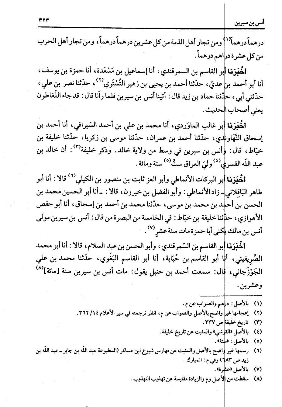 درهما درهما (1) ومن تجار أهل الذمة من كل عشرين درهما درهما ومن تجار أهل الحرب من كل عشرة دراهم درهما أخبرنا أبو القاسم بن السمرقندي أنا إسماعيل بن مسعدة أنا حمزة بن يوسف أنا أبو أحمد بن عدي حدثنا أحمد بن يحيى بن زهير التستري (2) حدثنا نصر بن علي حدثني أبي حدثنا حماد بن زيد قال أتينا أنس بن سيرين فلما رآنا قال قد جاء اللغاطون يعني أصحاب الحديث أخبرنا أبو غالب الماوردي أنا محمد بن علي بن أحمد السيرافي أنا أحمد بن إسحاق النهاوندي حدثنا أحمد بن عمران حدثنا موسى بن زكريا حدثنا خليفة بن خياط قال وأنس بن سيرين في وسط من ولاية خالد وذكر خليفة (3) أن خالد بن عبد الله القسري (4) ولي العراق ست (5) ستة ومائة أخبرنا أبو البركات الأنماطي وأبو العز ثابت بن منصور بن الكيلي (6) قالا أنا أبو طاهر الباقلاني زاد الأنماطي وأبو الفضل بن خيرون قالا أنا أبو الحسين محمد بن الحسن بن أحمد بن محمد بن موسى حدثنا محمد بن أحمد بن إسحاق أنا أبو حفص الأهوازي حدثنا خليفة بن خياط في الخامسة من البصرة من قال أنس بن سيرين مولى أنس بن مالك يكنى أبا حمزة مات سنة عشر (7) أخبرنا أبو القاسم بن السمرقندي وأبو الحسن بن عبد السلام قالا أنا أبو محمد الصريفيني أنا أبو القاسم بن حبابة أنا أبو القاسم البغوي حدثنا محمد بن علي الجوزجاني قال سمعت أحمد بن حنبل يقول مات أنس بن سيرين سنة مائة (8) وعشرين