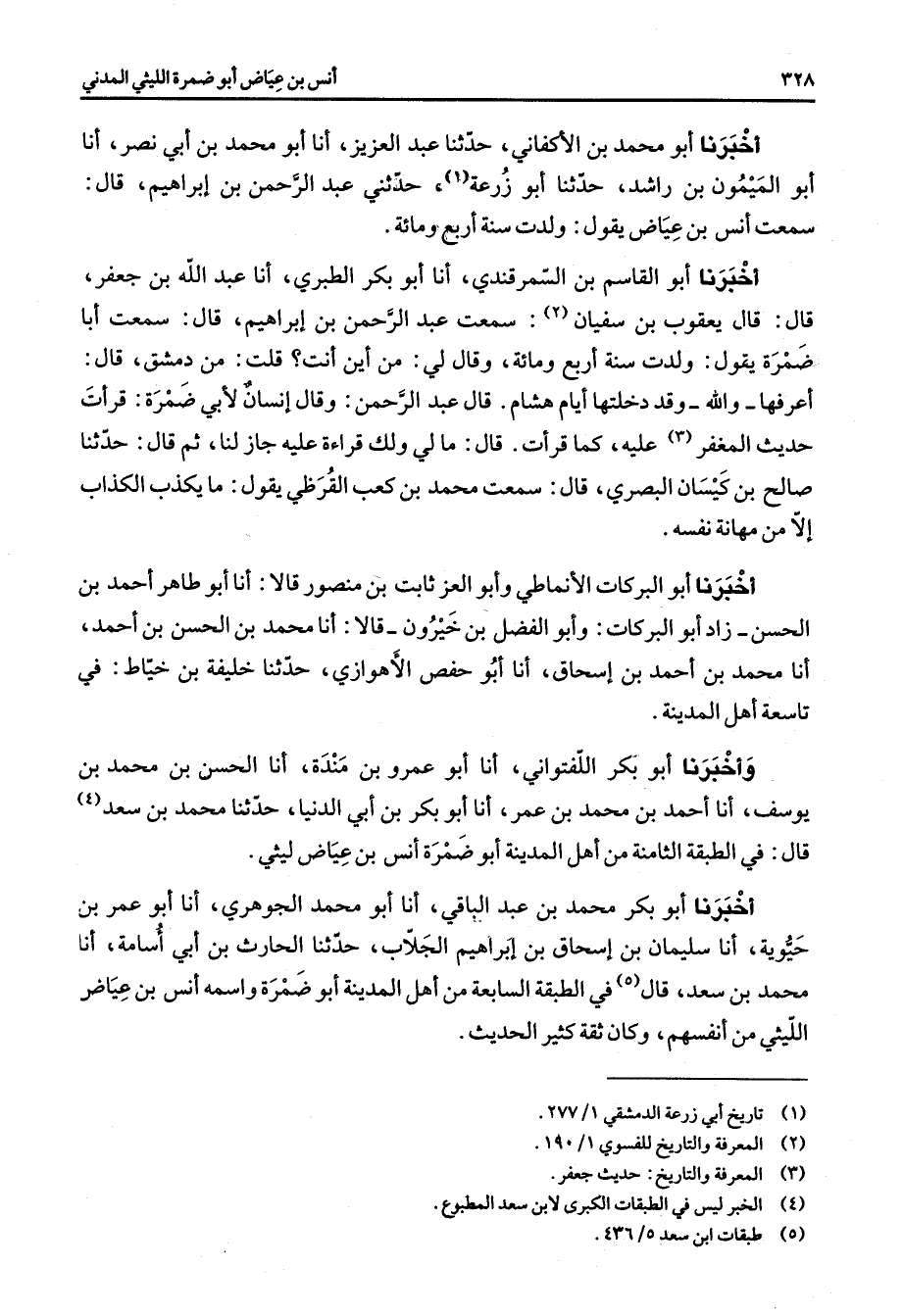 أخبرنا أبو محمد بن الأكفاني حدثنا عبد العزيز أنا أبو محمد بن أبي نصر أنا أبو الميمون بن راشد حدثنا أبو زرعة (1) حدثني عبد الرحمن بن إبراهيم قال سمعت أنس بن عياض يقول ولدت سنة أربع ومائة أخبرنا أبو القاسم بن السمرقندي أنا أبو بكر الطبري أنا عبد الله بن جعفر قال قال يعقوب بن سفيان (2) سمعت عبد الرحمن بن إبراهيم قال سمعت أبا ضمرة يقول ولدت سنة أربع ومائة وقال لي من أين أنت قلت من دمشق قال أعرفها والله وقد دخلتها أيام هشام قال عبد الرحمن وقال إنسان لأبي ضمرة قرأت حديث المغفر (3) عليه كما قرأت قال ما لي ولك قراءة عليه جاز لنا ثم قال حدثنا صالح بن كيسان البصري قال سمعت محمد بن كعب القرظي يقول ما يكذب الكذاب إلا من مهانة نفسه أخبرنا أبو البركات الأنماطي وأبو العز ثابت بن منصور قالا أنا أبو طاهر أحمد بن الحسن زاد أبو البركات وأبو الفضل بن خيرون قالا أنا محمد بن الحسن بن أحمد أنا محمد بن أحمد بن إسحاق أنا أبو حفص الأهوازي حدثنا خليفة بن خياط في تاسعة أهل المدينة وأخبرنا أبو بكر اللفتواني أنا أبو عمرو بن مندة أنا الحسن بن محمد بن يوسف أنا احمد بن محمد بن عمر أنا أبو بكر بن أبي الدنيا حدثنا محمد بن سعد (4) قال في الطبقة الثامنة من أهل المدينة أبو ضمرة أنس بن عياض ليثي اخبرنا أبو بكر محمد بن عبد الباقي أنا أبو محمد الجوهري أنا أبو عمر بن حيوية أنا سليمان بن إسحاق بن إبراهيم الجلاب حدثنا الحارث بن أبي أسامة أنا محمد بن سعد قال (5) في الطبقة السابعة من أهل المدينة أبو ضمرة واسمه أنس ين عياض الليثي من أنفسهم وكان ثقة كثير الحديث