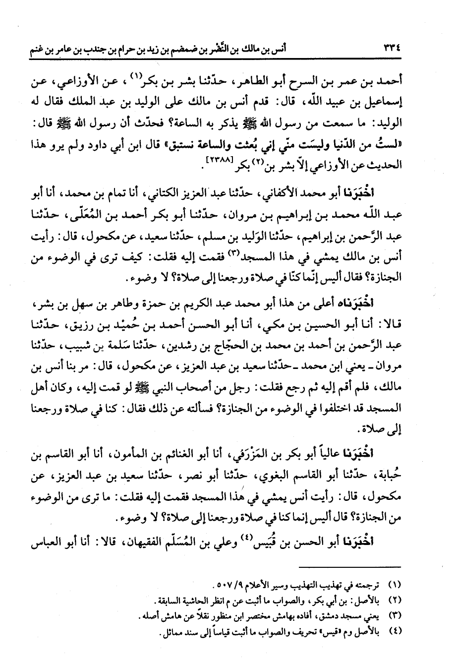 أحمد بن عمر بن السرح أبو الطاهر حدثنا بشر بن بكر (1) عن الأوزاعي عن إسماعيل بن عبيد الله قال قدم أنس بن مالك على الوليد بن عبد الملك فقال له الوليد ما سمعت من رسول الله (صلى الله عليه وسلم) يذكر به الساعة فحدث أن رسول الله (صلى الله عليه وسلم) قال لست من الدنيا وليست مني إني بعثت والساعة نستبق قال ابن أبي داود ولم يرو هذا الحديث عن الأوزاعي إلا بشر بن (2) بكر أخبرنا أبو محمد الأكفاني حدثنا عبد العزيز الكتاني أنا تمام بن محمد أنا أبو عبد الله محمد بن إبراهيم بن مروان حدثنا أبو بكر أحمد بن المعلى حدثنا عبد الرحمن بن إبراهيم حدثنا الوليد بن مسلم حدثنا سعيد عن مكحول قال رأيت أنس بن مالك يمشي في هذا المسجد (3) فقمت إليه فقلت كيف ترى في الوضوء من الجنازة فقال أليس إنما كنا في صلاة ورجعنا إلى صلاة لا وضوء أخبرناه أعلى من هذا أبو محمد عبد الكريم بن حمزة وطاهر بن سهل بن بشر قالا أنا أبو الحسين بن مكي أنا أبو الحسن أحمد بن حميد بن رزيق حدثنا عبد الرحمن بن أحمد بن محمد بن الحجاج بن رشدين حدثنا سلمة بن شبيب حدثنا مروان يعني ابن محمد حدثنا سعيد بن عبد العزيز عن مكحول قال مر بنا أنس بن مالك فلم أقم إليه ثم رجع فقلت رجل من أصحاب النبي (صلى الله عليه وسلم) لو قمت إليه وكان أهل المسجد قد اختلفوا في الوضوء من الجنازة فسألته عن ذلك فقال كنا في صلاة ورجعنا إلى الصلاة اخبرنا عاليا أبو بكر بن المزرقي أنا أبو الغنائم بن المأمون أنا أبو القاسم بن حبابة حدثنا أبو القاسم البغوي حدثنا أبو نصر حدثنا سعيد بن عبد العزيز عن مكحول قال رأيت أنس يمشي في هذا المسجد فقمت إليه فقلت ما ترى من الوضوء من الجنازة قال أليس إنما كنا في صلاة ورجعنا إلى صلاة لا وضوء أخبرنا أبو الحسن بن قبيس (4) وعلي بن المسلم الفقيهان قالا أنا أبو العباس