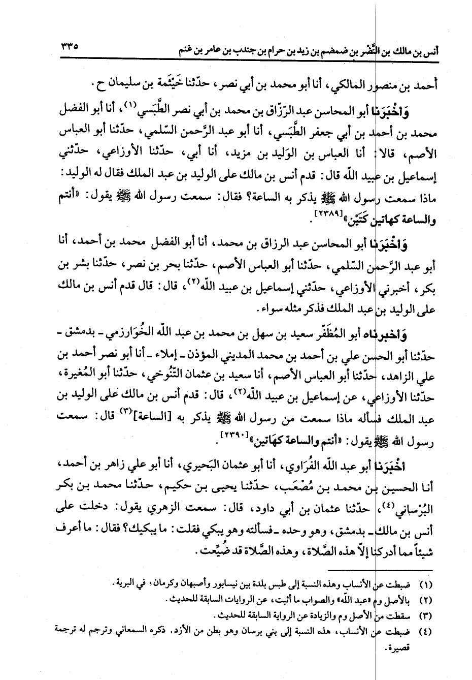 أحمد بن منصور المالكي أنا أبو محمد بن أبي نصر حدثنا خيثمة بن سليمان وأخبرنا أبو المحاسن عبد الرزاق بن محمد بن أبي نصر الطبسي (1) أنا أبو الفضل محمد بن أحمد بن أبي جعفر الطبسي أنا أبو عبد الرحمن السلمي حدثنا أبو العباس الأصم قالا أنا العباس بن الوليد بن مزيد أنا أبي حدثنا الأوزاعي حدثني إسماعيل بن عبيد الله قال قدم أنس بن مالك على الوليد بن عبد الملك فقال له الوليد ماذا سمعت رسول الله (صلى الله عليه وسلم) يذكر به الساعة فقال سمعت رسول الله (صلى الله عليه وسلم) يقول أنتم والساعة كهاتين كتين وأخبرنا أبو المحاسن عبد الرزاق بن محمد أنا أبو الفضل محمد بن أحمد أنا أبو عبد الرحمن السلمي حدثنا أبو العباس الأصم حدثنا بحر بن نصر حدثنا بشر بن بكر أخبرني الأوزاعي حدثني إسماعيل بن عبيد الله (2) قال قال قدم أنس بن مالك على الوليد بن عبد الملك فذكر مثله سواء وأخبرناه أبو المظفر سعيد بن سهل بن محمد بن عبد الله الخوارزمي بدمشق حدثنا أبو الحسن علي بن احمد بن محمد المديني المؤذن إملاء أنا أبو نصر أحمد بن علي الزاهد حدثنا أبو العباس الأصم أنا سعيد بن عثمان التنوخي حدثنا أبو المغيرة حدثنا الأوزاعي عن إسماعيل بن عبيد الله (2) قال قدم أنس بن مالك على الوليد بن عبد الملك فسأله ماذا سمعت من رسول الله (صلى الله عليه وسلم) يذكر به الساعة (3) قال سمعت رسول الله (صلى الله عليه وسلم) يقول أنتم والساعة كهاتين أخبرنا أبو عبد الله الفراوي أنا أبو عثمان البحيري أنا أبو علي زاهر بن احمد أنا الحسين بن محمد بن مصعب حدثنا يحيى بن حكيم حدثنا محمد بن بكر البرساني (4) حدثنا عثمان بن أبي داود قال سمعت الزهري يقول دخلت على أنس بن مالك بدمشق وهو وحده فسألته وهو يبكي فقلت ما يبكيك فقال ما أعرف شيئا مما أدركنا إلا هذه الصلاة وهذه الصلاة قد ضيعت