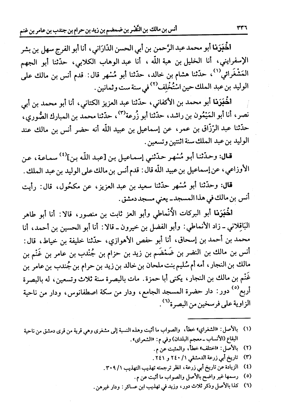 أخبرنا أبو محمد عبد الرحمن بن أبي الحسن الداراني أنا أبو الفرج سهل بن بشر الإسفرايني أنا الخليل بن هبة الله أنا عبد الوهاب الكلابي حدثنا أبو الجهم المشغرائي (1) حدثنا هشام بن خالد حدثنا أبو مسهر قال قدم أنس بن مالك على الوليد بن عبد الملك حين استخلف (2) في سنة ست وثمانين أخبرنا أبو محمد بن الأكفاني حدثنا عبد العزيز الكتاني أنا أبو محمد بن أبي نصر أنا أبو الميمون بن راشد حدثنا أبو زرعة (3) حدثنا محمد بن المبارك الصوري حدثنا عبد الرزاق بن عمر عن إسماعيل بن عبيد الله أنه حضر أنس بن مالك عند الوليد بن عبد الملك سنة اثنتين وتسعين قال وحدثنا أبو مسهر حدثني إسماعيل بن عبد الله بن (4) سماعة عن الأوزاعي عن إسماعيل بن عبيد الله قال قدم أنس بن مالك على الوليد بن عبد الملك قال وحدثنا أبو مسهر حدثنا سعيد بن عبد العزيز عن مكحول قال رأيت أنس بن مالك في هذا المسجد يعني مسجد دمشق أخبرنا أبو البركات الأنماطي وأبو العز ثابت بن منصور قالا أنا أبو طاهر الباقلاني زاد الأنماطي وأبو الفضل بن خيرون قالا أنا أبو الحسين بن أحمد أنا محمد بن احمد بن إسحاق أنا أبو حفص الأهوازي حدثنا خليفة بن خياط قال أنس بن مالك بن النضر بن ضمضم بن زيد بن حرام بن جندب بن عامر بن غنم بن مالك بن النجار أمه أم سليم بنت ملحان بن خالد بن زيد بن حزام بن جندب بن عامر بن غنم بن مالك بن النجار يكنى أبا حمزة مات بالبصرة سنة ثلاث وتسعين له بالبصرة أربع (5) دور دار حضرة المسجد الجامع ودار من سكة اصطفانوس ودار من ناحية الزاوية على فرسخين من البصرة (6)