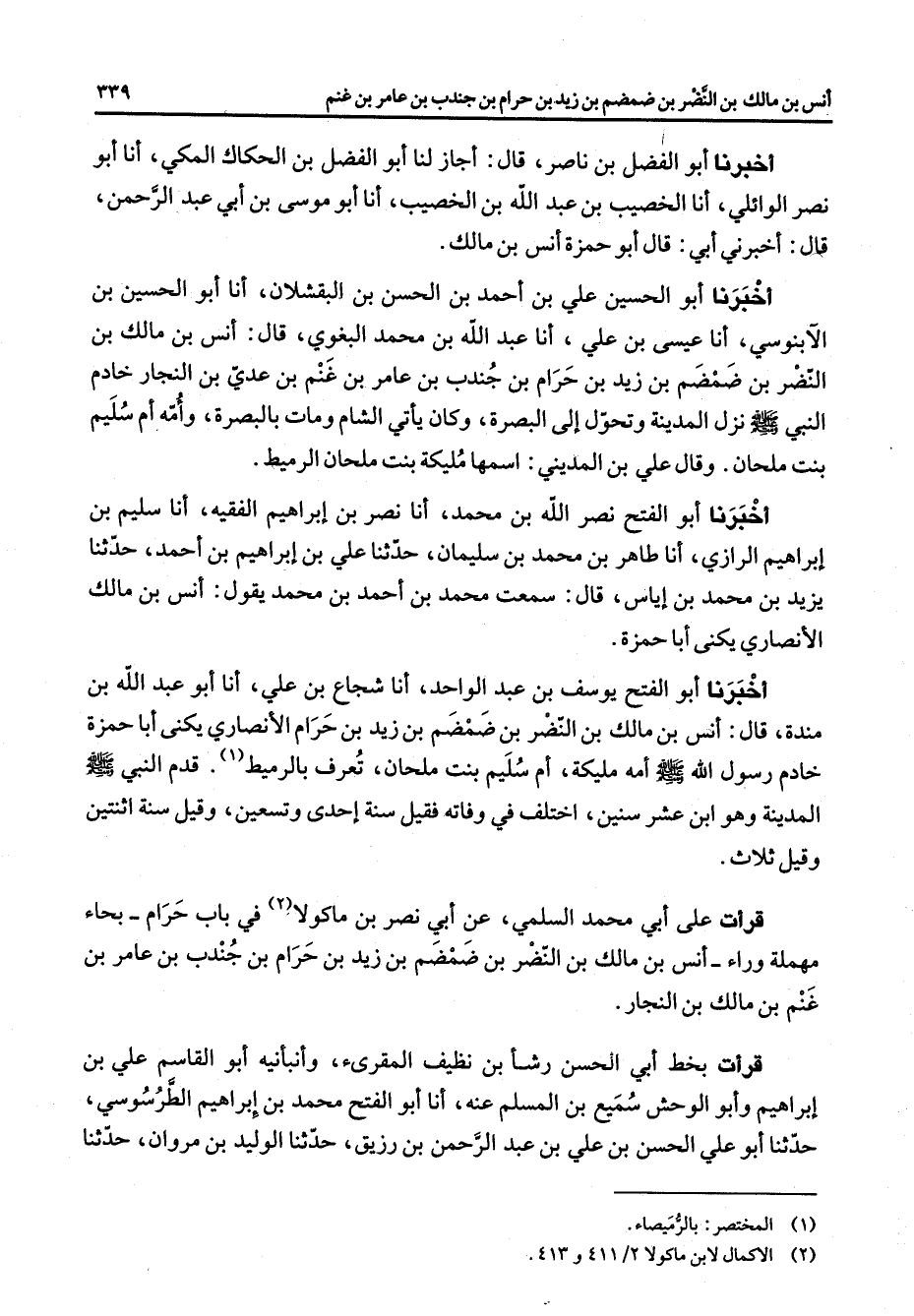 أخبرنا أبو الفضل بن ناصر قال أجاز لنا أبو الفضل بن الحكاك المكي أنا أبو نصر الوائلي أنا الخصيب بن عبد الله بن الخصيب أنا أبو موسى بن أبي عبد الرحمن قال أخبرني أبي قال أبو حمزة أنس بن مالك أخبرنا أبو الحسين علي بن أحمد بن الحسن بن البقشلان أنا أبو الحسين بن الآبنوسي أنا عيسى بن علي أنا عبد الله بن محمد البغوي قال أنس بن مالك بن النضر بن ضمضم بن زيد بن حرام بن جندب بن عامر بن غنم بن عدي بن النجار خادم النبي (صلى الله عليه وسلم) نزل المدينة وتحول إلى البصرة وكان يأتي الشام ومات بالبصرة وأمه أم سليم بنت ملحان وقال علي بن المديني اسمها مليكة بنت ملحان الرميط أخبرنا أبو الفتح نصر الله بن محمد أنا نصر بن إبراهيم الفقيه أنا سليم بن إبراهيم الرازي أنا طاهر بن محمد بن سليمان حدثنا علي بن إبراهيم بن أحمد حدثنا يزيد بن محمد بن إياس قال سمعت محمد بن أحمد بن محمد يقول أنس بن مالك الأنصاري يكنى أبا حمزة أخبرنا أبو الفتح يوسف بن عبد الواحد أنا شجاع بن علي أنا أبو عبد الله بن مندة قال انس بن مالك بن النضر بن ضمضم بن زيد بن حرام الأنصاري يكنى أبا حمزة خادم رسول الله (صلى الله عليه وسلم) أمه مليكة أم سليم بنت ملحان تعرف بالرميط (1) قدم النبي (صلى الله عليه وسلم) المدينة وهو ابن عشر سنين اختلف في وفاته فقيل سنة إحدى وتسعين وقيل سنة اثنتين وقيل ثلاث قرأت على أبي محمد السلمي عن أبي نصر بن ماكولا (2) في باب حرام بحاء مهملة وراء أنس بن مالك بن النضر بن ضمضم بن زيد بن حرام بن جندب بن عامر بن غنم بن مالك بن النجار قرأت بخط أبي الحسن رشأ بن نظيف المقرئ وأنبأنيه أبو القاسم علي بن إبراهيم وأبو الوحش سميع بن المسلم عنه أنا أبو الفتح محمد بن إبراهيم الطرطوسي حدثنا أبو علي الحسن بن علي بن عبد الرحمن بن رزيق حدثنا الوليد بن مروان حدثنا