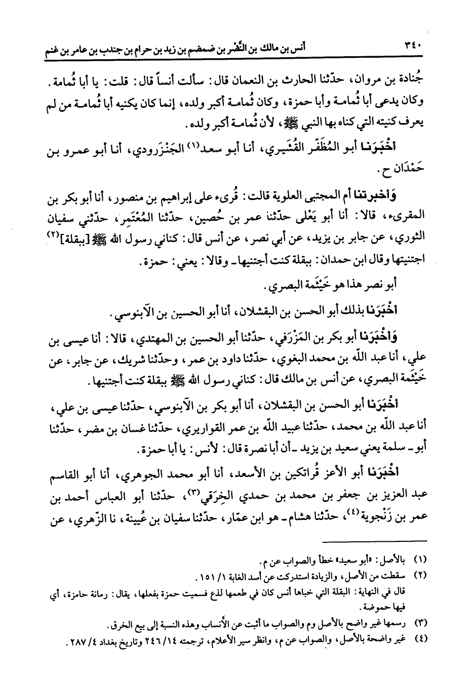 جنادة بن مروان حدثنا الحارث بن النعمان قال سألت أنسا قال قلت يا أبا ثمامة وكان يدعى أبا ثمامة وأبا حمزة وكان ثمامة أكبر ولده إنما كان يكنيه أبا ثمامة من لم يعرف كنيته التي كناه بها النبي صلى الله عليه وسلم) لأن ثمامة أكبر ولده أخبرنا أبو المظفر القشيري أنا أبو سعد (1) الجنزرودي أنا أبو عمرو بن حمدان ح وأخبرتنا أم المجتبى العلوية قالت قرئ على إبراهيم بن منصور أنا أبو بكر بن المقرئ قالا أنا أبو يعلى حدثنا عمر بن حصين حدثنا المعتمر حدثني سفيان الثوري عن جابر بن يزيد عن أبي نصر عن أنس قال كناني رسول الله (صلى الله عليه وسلم) ببقلة (2) اجتنيتها وقال ابن حمدان ببقلة كنت أجتنيها وقالا يعني حمزة أبو نصر هذا هو خيثمة البصري أخبرنا بذلك أبو الحسن بن البقشلان أنا أبو الحسين بن الآبنوسي وأخبرنا أبو بكر بن المزرفي حدثنا أبو الحسين بن المهتدي قالا أنا عيسى بن علي أنا عبد الله بن محمد البغوي حدثنا داود بن عمر وحدثنا شريك عن جابر عن خيثمة البصري عن أنس بن مالك قال كناني رسول الله (صلى الله عليه وسلم) ببقلة كنت أجتنيها وأخبرنا أبو الحسن بن البقشلان أنا أبو بكر بن الآبنوسي حدثنا عيسى بن علي أنا عبد الله بن محمد حدثنا عبيد الله بن عمر القواريري حدثنا غسان بن مضر حدثنا أبو سلمة يعني سعيد بن يزيد أن أبا نصرة قال لأنس يا أبا حمزة أخبرنا أبو الأعز قراتكين بن الأسعد أنا أبو محمد الجوهري أنا أبو القاسم عبد العزيز بن جعفر بن محمد بن حمدي الخرقي (3) حدثنا أبو العباس أحمد بن عمر بن زنجوية (4) حدثنا هشام هو ابن عمار حدثنا سفيان بن عيينة نا الزهري عن