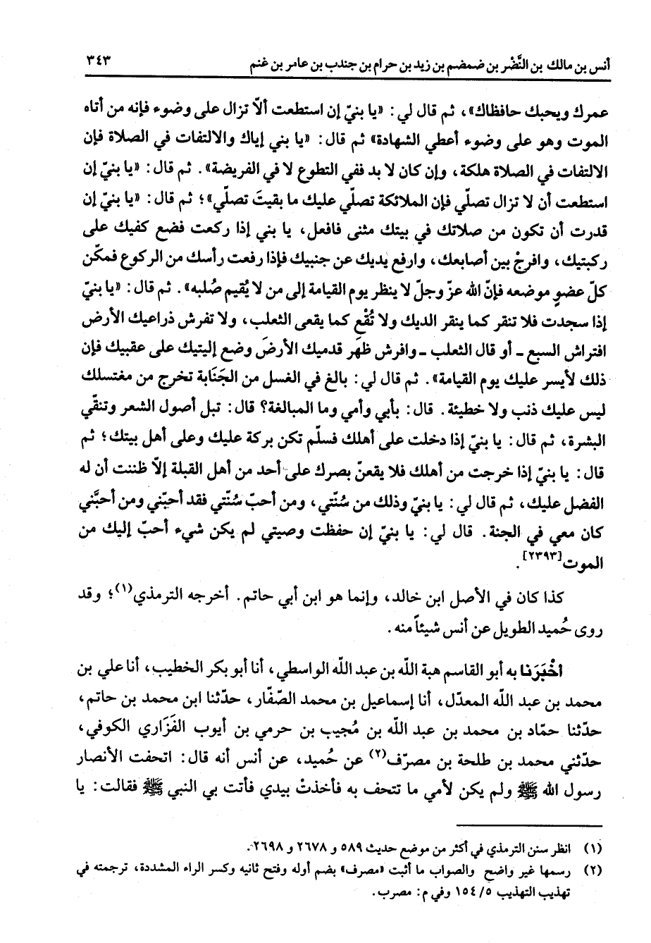 عمرك ويحبك حافظاك ثم قال لي يا بني إن استطعت ألا تزال على وضوء فإنه من أتاه الموت وهو على وضوء أعطي الشهادة ثم قال يا بني إياك والالتفات في الصلاة فإن الالتفات في الصلاة هلكة وإن كان لابد ففي التطوع لا في الفريضة ثم قال يا بني إن استطعت أن لا تزال تصلي فإن الملائكة تصلي عليك ما بقيت تصلي ثم قال يا بني إن قدرت أن تكون من صلاتك في بيتك مثنى فافعل يا بني إذا ركعت فضع كفيك على ركبتيك وافرج بين أصابعك وارفع يديك عن جنبيك فإذرفعت رأسك من الركوع فمكن كل عضو موضعه فإن الله عز وجل لا ينظر يوم القيامة إلى من لا يقيم صلبه ثم قال يا بني إذا سجدت فلا تنقر كما ينقر الديك ولا تقع كما يقعى الثعلب ولا تفرش ذراعيك الأرض افتراش السبع أو قال الثعلب وافرش ظهر قدميك الأرض وضع إليتيك على عقبيك فإن ذلك لأيسر عليك يوم القيامة ثم قال لي بالغ في الغسل من الجنابة تخرج من مغتسلك ليس عليك ذنب ولا خطيئة قال بأبي وأمي وما المبالغة قال تبل أصول الشعر وتنقي البشرة ثم قال يا بني إذا دخلت على أهلك فسلم تكن بركة عليك وعلى أهل بيتك ثم قال يا بني إذا خرجت من أهلك فيقعن بصرك على أحد من أهل القبلة إلا ظننت أن له الفضل عليك ثم قال لي يا بني وذلك من سنتي ومن أحب سنتي فقد احبني ومن أحبني كان معي في الجنة قال لي يا بني إن حفظت وصيتي لم يكن شئ أحب إليك من الموت كذا كان في الأصل ابن خالد وإنما هو ابن أبي حاتم أخرجه الترمذي (1) وقد روى حميد الطويل عن أنس شيئا منه أخبرنا به أبو القاسم هبة الله بن عبد الله الواسطي أنا أبو بكر الخطيب أنا علي بن محمد بن عبد الله المعدل أنا إسماعيل بن محمد الصفار حدثنا ابن محمد بن حاتم حدثنا حماد بن محمد بن عبد الله بن مجيب بن حرمي بن أيوب الفزاري الكوفي حدثني محمد بن طلحة بن مصرف (2) عن حميد عن أنس أنه قال اتحفت الأنصار رسول الله (صلى الله عليه وسلم) ولم يكن لأمي ما تتحف به فأخذت بيدي فأتت بي النبي (صلى الله عليه وسلم) فقالت يا