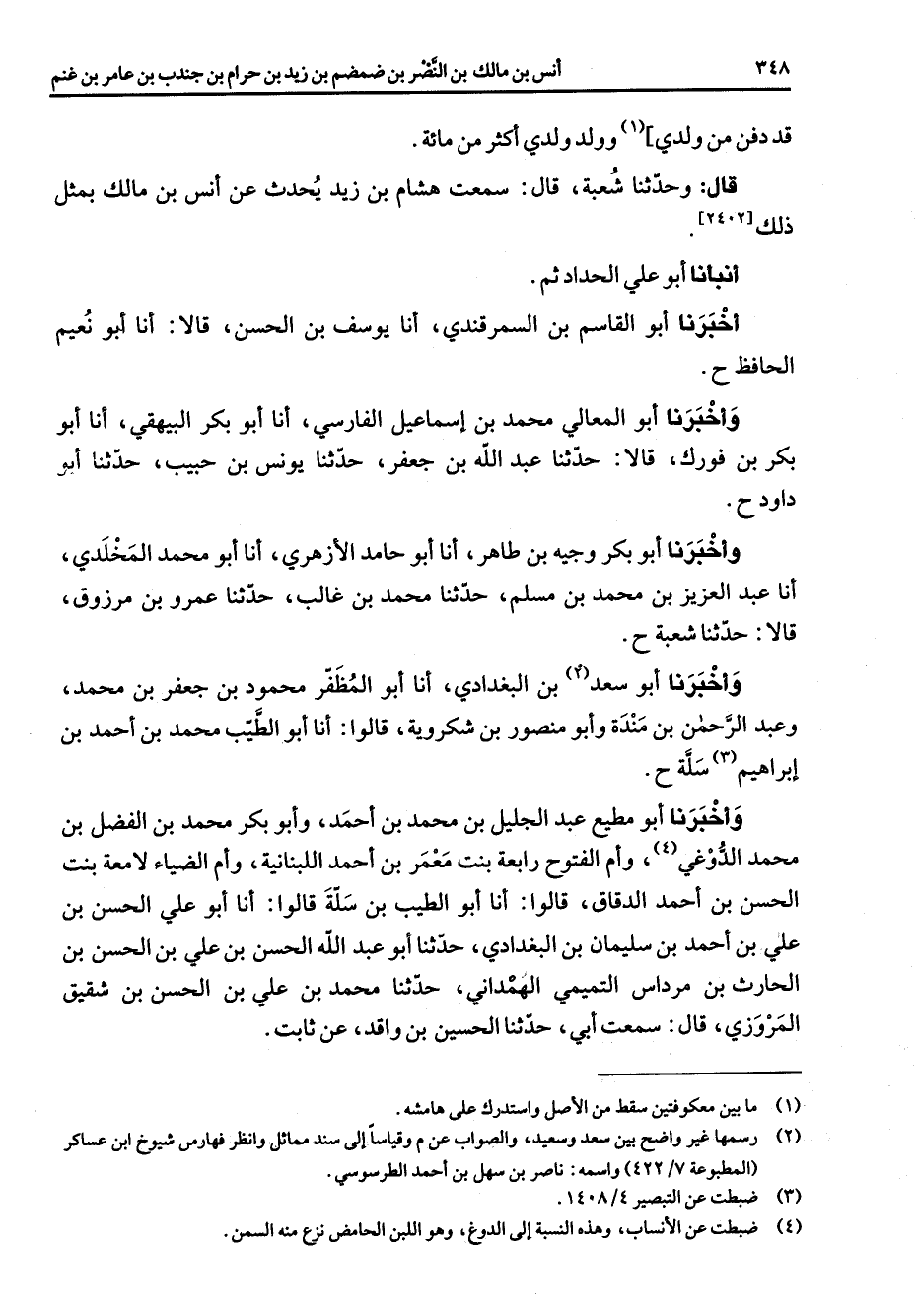 قد دفن من ولدي (1) وولد ولدي أكثر من مائة قال وحدثنا شعبة قال سمعت هشام بن زيد يحدث عن أنس بن مالك بمثل ذلك أنبأنا أبو علي الحداد ثم أخبرنا أبو القاسم بن السمرقندي أنا يوسف بن الحسن قالا أنا أبو نعيم الحافظ ح وأخبرنا أبو المعالي محمد بن إسماعيل الفارسي أنا أبو بكر البيهقي أنا أبو بكر بن فورك قالا حدثنا عبد الله بن جعفر حدثنا يونس بن حبيب حدثنا أبو داود ح وأخبرنا أبو بكر وجيه بن طاهر أنا أبو حامد الأزهري أنا أبو محمد المخلدي أنا عبد العزيز بن محمد بن مسلم حدثنا محمد بن غالب حدثنا عمرو بن مرزوق قال حدثنا شعبة ح وأخبرنا أبو سعد (2) بن البغدادي أنا أبو المظفر محمود بن جعفر بن محمد وعبد الرحمن بن مندة وأبو منصور بن شكروية قالوا أنا أبو الطيب محمد بن أحمد بن إبراهيم (3) سلة ح وأخبرنا أبي مطيع عبد الجليل بن محمد بن أحمد وأبو بكر محمد بن الفضل بن محمد الدوغي (4) وأم الفتوح رابعة بنت معمر بن أحمد اللبنانية وأم الضياء لامعة بنت الحسن بن أحمد الدقاق قالوا أنا أبو الطيب بن سلة قالوا أنا أبو علي الحسن بن علي بن أحمد بن سليمان بن البغدادي حدثنا أبو عبد الله الحسن بن علي بن الحسن بن الحارث بن مرداس التميمي الهمداني حدثنا محمد بن علي بن الحسن بن شقيق المروزي قال سمعت أبي حدثنا الحسين بن واقد عن ثابت