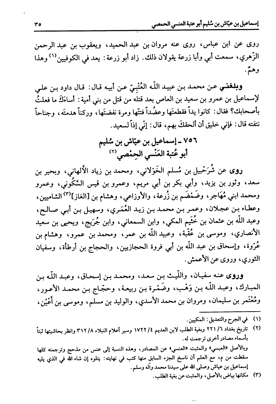 756 - إسماعيل بن عياش بن سليم أبو عتبة العنسي الحمصي (2) روى عن شرحبيل بن مسلم الخولاني ومحمد بن زياد الألهاني وبحير بن سعد وثور بن يزيد وأبي بكر بن أبي مريم وعمرو بن قيس السكوني وعمرو ومحمد ابني مهاجر وضمضم بن زرعة والأوزاعي وهشام بن الغاز (3) الشاميين وعطاء بن عجلان وعمر بن محمد بن زيد العمري وسهيل بن أبي صالح وعبد الله بن عثمان بن خثيم المكي وابن السمعاني وابن جريج ويحي بن سعيد الأنصاري وموسى بن عقبة وعبيد الله بن عمر ومحمد بن عمرو وهشام بن عروة وإسحاق بن عبد الله بن أبي فروة الحجازيين والحجاج بن أرطأة وسفيان الثوري وروى عن الأعمش وروى عنه سفيان والليث بن سعد ومحمد بن إسحاق وعبد الله بن المبارك وعبد الله بن وهب وضمرة بن ربيعة وحجاج بن محمد الأعور ومعتمر بن سليمان ومروان بن محمد الأسدي والوليد بن مسلم وموسى بن أعين