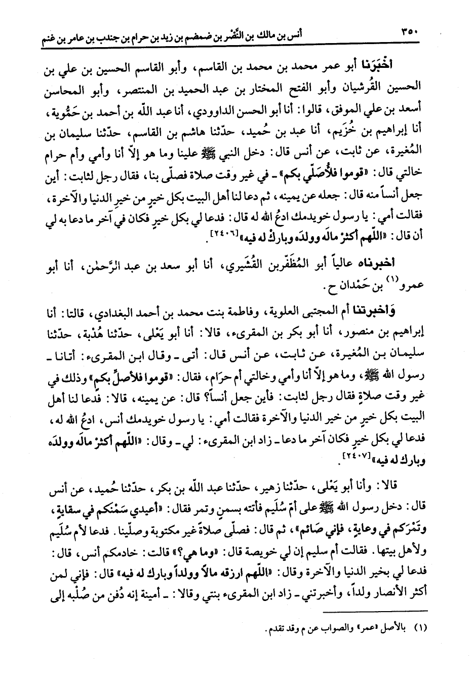 أخبرنا أبو عمر محمد بن محمد بن القاسم وأبو القاسم الحسين بن علي بن الحسين القرشيان وأبو الفتح المختار بن عبد الحميد بن المنتصر وأبو المحاسن اسعد بن علي الموفق قالوا أنا أبو الحسن الداوودي أنا عبد الله بن احمد بن حيوية أنا إبراهيم بن خزيم أنا عبد بن حميد حدثنا هاشم بن القاسم حدثنا سليمان بن المغيرة عن ثابت عن أنس قال دخل النبي (صلى الله عليه وسلم) علينا وما هو إلا أنا وأمي وأم حرام خالتي قال قوموا فلأصلي بكم في غير وقت صلاة فصلى بنا فقال رجل لثابت أين جعل أنسا منه قال جعله عن يمينه ثم دعا لنا أهل البيت بكل خير من خير الدنيا والآخرة فقالت أمي يا رسول خويدمك ادع الله له قال فدعا لي بكل خير فكان في آخر ما دعا به لي أن قال اللهم أكثر ماله وولده وبارك له فيه أخبرناه عاليا أبو المظفر بن القشيري أنا أبو سعد بن عبد الرحمن أنا أبو عمرو (1) بن حمدان ح وأخبرتنا أم المجتبى العلوية وفاطمة بنت محمد بن أحمد البغدادي قالتا أنا إبراهيم بن منصور أنا أبو بكر بن المقرئ قالا أنا أبو يعلى حدثنا هدبة حدثنا سليمان بن المغيرة عن ثابت عن أنس قال أتى وقال ابن المقرئ أتانا