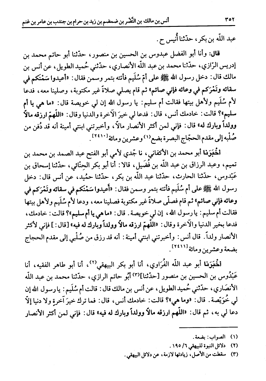 عبد الله بن بكر حدثنا أنيس ح قال وأنا أبو الفضل عبدوس بن الحسين بن منصور حدثنا أبو حاتم محمد بن إدريس الرازي حدثنا محمد بن عبد الله الأنصاري حدثني حميد الطويل عن أنس بن مالك قال دخل رسول الله (صلى الله عليه وسلم) على أم سليم فأتته بتمر وسمن فقال أعيدوا سمنكم في سقائه وتمركم في وعائه فإني صائم ثم قام يصلي صلاة غير مكتوبة وصلينا معه فدعا لأم سليم ولأهل بيتها فقالت أم سليم يا رسول الله إن لي خويصة قال ما هي يا أم سليم قالت خادمك أنس قال فدعا لي خيرا الآخرة والدنيا وقال اللهم ارزقه مالا وولدا وبارك له قا فإني لمن أكثر الأنصار مالا وأخبرتني ابنتي أمينة أنه قد دفن من صلبه إلى مقدم الحجاج البصرة بضع (1) وعشرين ومائة أخبرنا أبو محمد بن الأكفاني نا جدي لأمي أبو الفتح عبد الصمد بن محمد بن تميم وعبد الرزاق بن عبد الله بن فضيل قالا أنا أبو بكر الحنائي حدثنا إسحاق بن عبدوس حدثنا الحارث حدثنا عبد الله بن بكر حدثنا حميد عن أنس قال دخل رسول الله (صلى الله عليه وسلم) على أم سليم فأتته بتمر وسمن فقال أعيدوا سمنكم في سقائه وتمركم في وعائه فإني صائم ثم قال فصلى صلاة غير مكتوبة فصلينا معه ودعا لأم سليم ولأهل بيتها فقالت أم سليم يا رسول الله إن لي خويصة قال ما هي يا أم سليم قالت خادمك فدعا بخير الدنيا والآخرة وقال اللهم ارزقه مالا وولدا وبارك له فيه قال فإني لأكثر الأنصار ولدا قال أنس وأخبرتني ابنتي امينة أنه قد رزق من صلبي إلى مقدم الحجاج بضعة وعشرين ومائة أخبرنا أبو عبد الله الفراوي أنا أبو بكر البيهقي (2) أنا أبو طاهر الفقيه أنا عبدوس بن الحسين ين منصور حدثنا (3) أبو حاتم الرازي حدثنا محمد بن عبد الله الأنصاري حدثني حميد الطويل عن أنس بن مالك قال قالت أم سليم يا رسول الله إن لي خويصة قال وما هي قالت خادمك أنس قال فما ترك خير آخرة ولا دنيا إلا دعا لي به ثم قال اللهم ارزقه مالا وولدا وبارك له فيه فإني لمن أكثر الأنصار