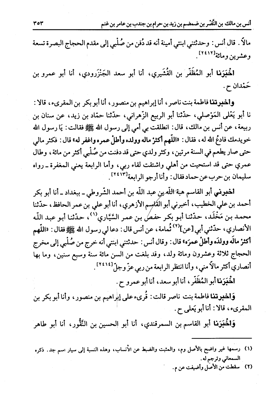 مالا قال أنس وحدثتني أمينة أنه قد دفن من صلبي إلى مقدم الحجاج البصرة تسعة وعشرين ومائة أخبرنا أبو المظفر بن القشيري أنا أبو سعد الجنزرودي أنا أبو عمرو بن حمدان ح وأخبرتنا فاطمة بنت ناصر أنا إبراهيم بن منصور أنا أبو بكر بن المقرئ قالا نا أبو يعلى الموصلي حدثنا أبو الربيع الزهراني حدثنا حماد بن زيد عن سنان بن ربيعة عن أنس بن مالك قال انطلقت بي أمي إلى رسول الله (صلى الله عليه وسلم) فقالت يا رسول الله خويدمك فادع الله له فقال اللهم أكثر ماله وولده وأطل عمره واغفر له قال فكثر مالي حتى صار يطعم في السنة مرتين وكثر ولدي حتى قد دفنت من صلبي أكثر من مائة وطال عمري حتى قد استحيت من أهلي واشتقت لقاء ربي وأما الرابعة يعني المغفرة رواه سليمان بن حرب عن حماد فقال وأنا أرجو الرابعة أخبرني أبو القاسم هبة الله بن عبد الله بن أحمد الشروطي ببغداد أنا أبو بكر أحمد بن علي الخطيب أخبرني أبو القاسم الأزهري أنا أبو علي بن عمر الحافظ حدثنا محمد بن مخلد حدثنا أبو بكر حفص بن عمر السياري (1) حدثنا أبو عبد الله الأنصاري حدثني أبي عن (2) ثمامة عن أنس قال دعا لي رسول الله (صلى الله عليه وسلم) فقال اللهم أكثر ماله وولده وأطل عمره قال وقال أنس حدثتني ابنتي أنه خرج من صلبي إلى مخرج الحجاج ثلاثة وعشرون ومائة ولد وقد بلغت من السن مائة سنة وسبع سنين وما بها أنصاري أكثر مالا مني وأنا انتظر الرابعة من ربي عز وجل أخبرنا أبو المظفر أنا أبو سعد أنا أبو عمرو ح واخبرتنا فاطمة بنت ناصر قالت قرئ على إبراهيم بن منصور وأنا أبو بكر بن المقرئ قالا أنا أبو يعلى ح وأخبرنا أبو القاسم بن السمرقندي أنا أبو الحسين بن النقور أنا أبو طاهر
