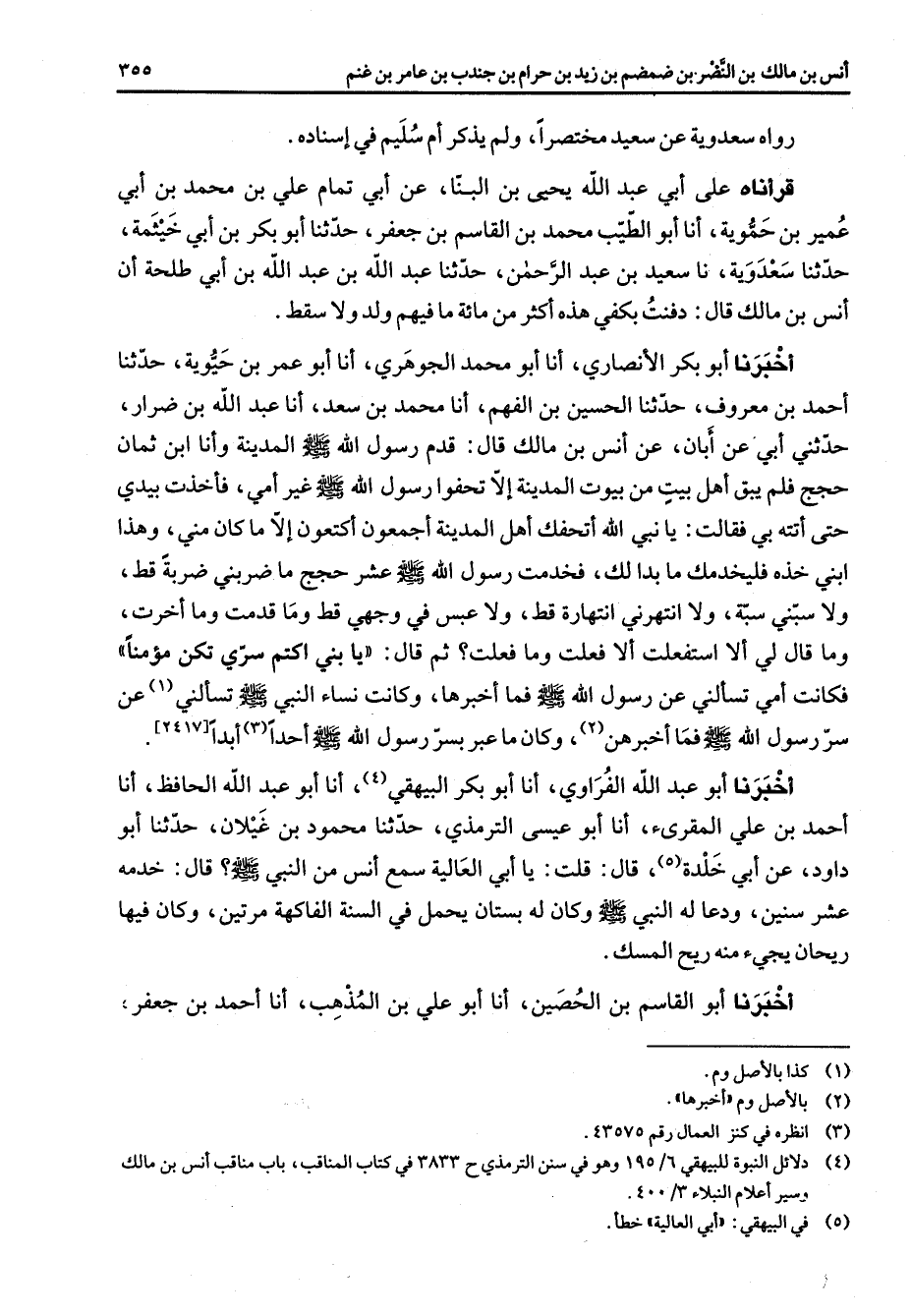 (4) دلائل النبوة للبيهقي 6 / 195 وهو في سنن الترمذي ح 3833 في كتاب المناقب باب مناقب أنس بن مالك