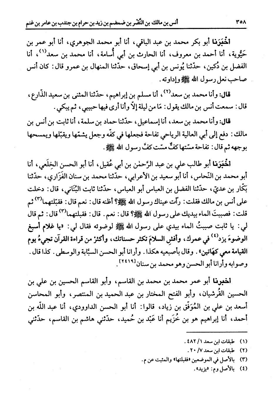 أخبرنا أبو بكر محمد بن عبد الباقي أنا أبو محمد الجوهري أنا أبو عمر بن حيوية أنا أحمد بن معروف أنا الحارث بن أبي أسامة أنا محمد بن سعد (1) أنا الفضل بن دكين حدثنا يونس بن أبي إسحاق حدثنا المنهال بن عمرو قال كان أنس صاحب نعل رسول الله (صلى الله عليه وسلم) وإداوته قال وأنا محمد بن سعد (2) أنا مسلم بن إبراهيم حدثنا المثنى بن سعيد الذارع قال سمعت أنس بن مالك يقول ما من ليلة إلا وأنا أرى فيها حبيبي ثم يبكي قال وأنا محمد بن سعد أنا إسماعيل حدثنا حماد بن سلمة أنا ثابت بن أنس بن مالك دفع إلى أبي العالية الرياحي تفاحة فجعلها في كفه وجعل يشمها ويقبلها ويمسحها بوجهه ثم قال تفاحة مستها كف مست كف رسول الله (صلى الله عليه وسلم) أخبرنا أبو طالب علي بن عبد الرحمن بن أبي عقيل أنا أبو الحسن الخلعي أنا أبو محمد بن النحاس أنا أبو سعيد بن الإعرابي حدثنا محمد بن سنان الفزاري حدثنا بكار بن عدي حدثنا الفضل بن العباس أبو العباس حدثنا ثابت البناني قال دخلت على أنس بن مالك فقلت رأت عيناك رسول الله (صلى الله عليه وسلم) أظنه قال نعم قال فقبلتهما (3) ثم قلت فصببت الماء بيديك على رسول الله (صلى الله عليه وسلم) قال نعم قال فقبلتهما (3) قال ثم قال لي يا ثابت صببت الماء بيدي على رسول الله (صلى الله عليه وسلم) لوضوئه فقال لي يا غلام أسبغ الوضوء يزد (4) في عمرك وأفش السلام تكثر حسناتك وأكثر من قراءة القرآن تجئ يوم القيامة معي كهاتين وقال بإصبعيه هكذا وأرانا أبو الحسن السبابة والوسطى كذا قال وصوابه وأرانا أبو الحسن وهو محمد بن سنان أخبرنا أبو عمر محمد بن محمد بن القاسم وأبو القاسم الحسين بن علي بن الحسين القرشيان وأبو الفتح المختار بن عبد الحميد بن المنتصر وأبو المحاسن أسعد بن علي بن الموفق بن زياد قالوا أنا أبو الحسن الداوودي أنا عبد الله بن أحمد أنا إبراهيم هو ابن خزيم أنا عبد بن حميد حدثني هاشم بن القاسم حدثني