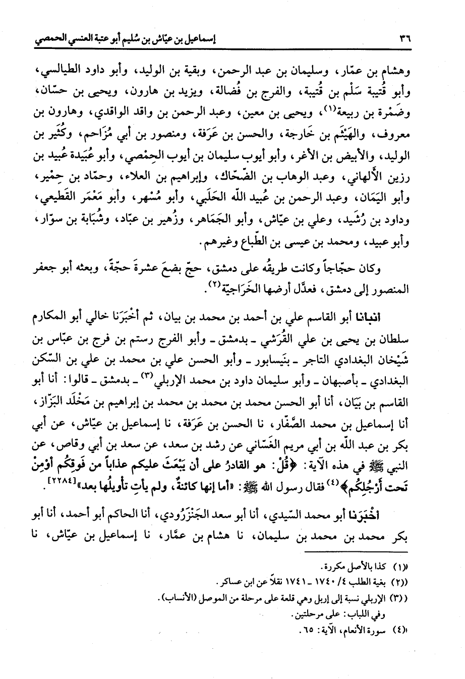 وهشام بن عمار وسليمان بن عبد الرحمن وبقية بن الوليد وأبو داود الطيالسي وأبو قتيبة سلم بن قتيبة والفرج بن فضالة ويزيد بن هارون ويحيى بن حسان وضمرة بن ربيعة (1) ويحيى بن معين وعبد الرحمن بن واقد الواقدي وهارون بن معروف والهيثم بن خارجة والحسن بن عرفة ومنصور بن أبي مزاحم وكثير بن الوليد والأبيض بن الأغر وأبو أيوب سليمان بن أيوب الحمصي وأبو عبيدة عبيد بن رزين الألهاني وعبد الوهاب بن الضحاك وإبراهيم بن العلاء وحماد بن حمير وأبو اليمان وعبد الرحمن بن عبيد الله الحلبي وأبو مسهر وأبو معمر القطيعي وداود بن رشيد وعلي بن عياش وأبو الجماهر وزهير بن عباد وشبابة بن سوار وأبو عبيد ومحمد بن عيسى بن الطباع وغيرهم وكان حجاجا وكانت طريقه على دمشق حج بضع عشرة حجة وبعثه أبو جعفر المنصور إلى دمشق فعدل أرضها الخراجية (2) أنبأنا أبو القاسم علي بن أحمد بن محمد بن بيان ثم أخبرنا خالي أبو المكارم سلطان بن يحيى بن علي القرشي بدمشق وأبو الفرج رستم بن فرج بن عباس بن شيخان البغدادي التاجر بنيسابور وأبو الحسن علي بن محمد بن علي بن السكن البغدادي بأصبهان وأبو سليمان داود بن محمد الإربلي (3) بدمشق قالوا أنا أبو القاسم بن بيان أنا أبو الحسن محمد بن محمد بن محمد بن إبراهيم بن مخلد البزاز أنا إسماعيل بن محمد الصفار نا الحسن بن عرفة نا إسماعيل بن عياش عن أبي بكر بن عبد الله بن أبي مريم الغساني عن رشد بن سعد عن سعد بن أبي وقاص عن النبي (صلى الله عليه وسلم) في هذه الآية " قل هو القادر على أن يبعث عليكم عذابا من فوقكم أو من تحت أرجلكم " (4) فقال رسول الله (صلى الله عليه وسلم) أنا إنها كائنة ولم يأت تأويلها بعد أخبرنا أبو محمد السيدي أنا أبو سعد الجنزرودي أنا الحاكم أبو أحمد أنا أبو بكر محمد بن محمد بن سليمان نا هشام بن عمار نا إسماعيل بن عياش نا