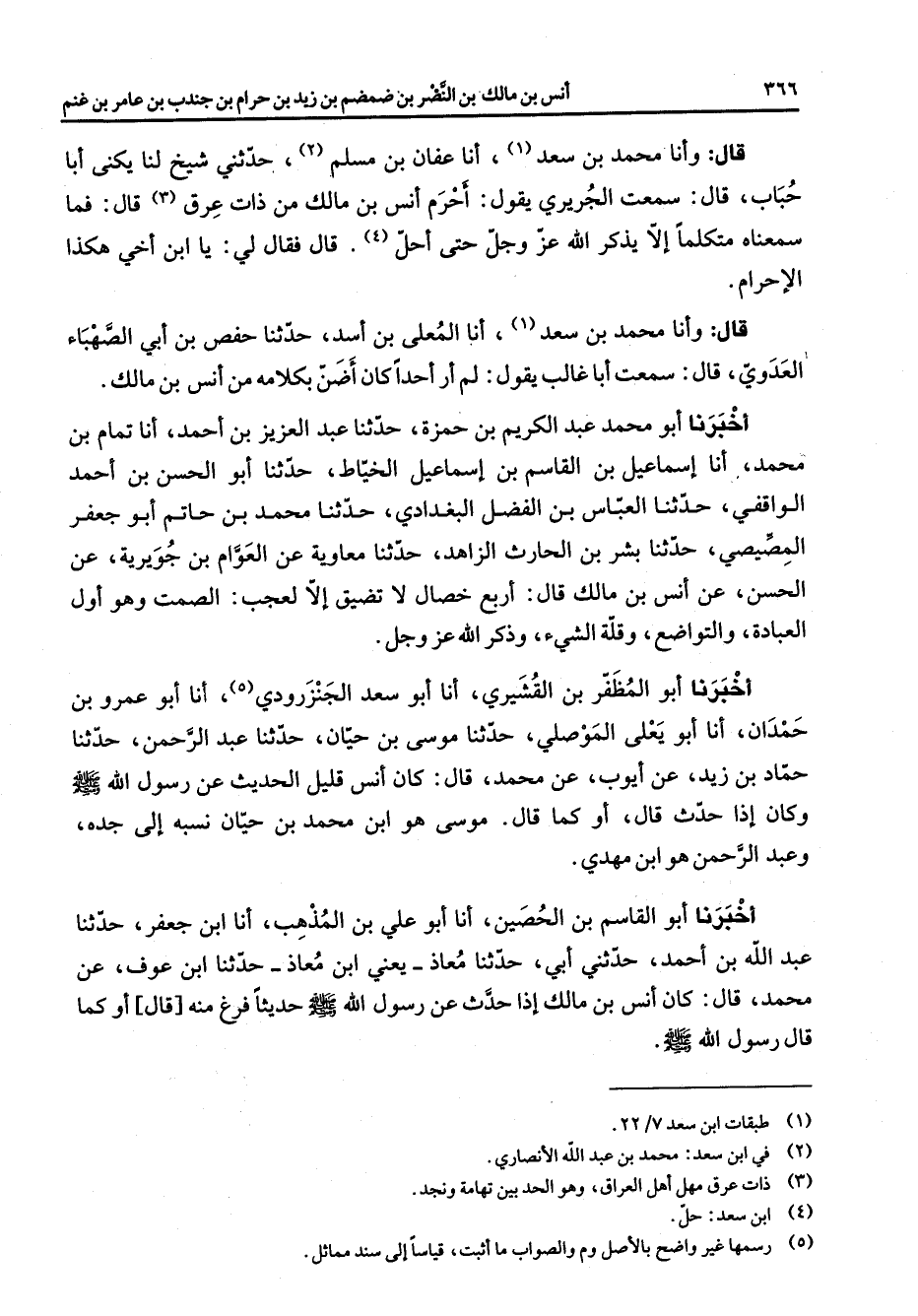 قال وأنا محمد بن سعد (1) أنا عفان بن مسلم (2) حدثني شيخ لنا يكنى أبا حباب قال سمعت الجريري يقول أحرم أنس بن مالك من ذات عرق (3) قال فما سمعناه متكلما إلا يذكر الله عز وجل حتى أحل (4) قال فقال لي يا ابن أخي هكذا الإحرام قال وأنا محمد بن سعد أنا المعلى بن أسد حدثنا حفص بن أبي الصهباء العدوي قال سمعت أبا غالب يقول لم أر أحدا كان أضن بكلامه من أنس بن مالك أخبرنا أبو محمد عبد الكريم بن حمزة حدثنا عبد العزيز بن أحمد أنا تمام بن محمد أنا إسماعيل بن القاسم بن إسماعيل الخياط حدثنا أبو الحسن بن أحمد الواقفي حدثنا العباس بن الفضل البغدادي حدثنا محمد بن حاتم أبو جعفر المصيصي حدثنا بشر بن الحارث الزاهد حدثنا معاوية عن العوام بن جويرية عن الحسن عن أنس بن مالك قال أربع خصال لا تضيق إلا لعجب الصمت وهو أول العبادة والتواضع وقلة الشئ وذكر الله عز وجل أخبرنا أبو المظفر بن القشيري أنا أبو سعد الجنزرودي (5) أنا أبو عمرو بن حمدان أنا أبو يعلى الموصلي حدثنا موسى بن حيان حدثنا عبد الرحمن حدثنا حماد بن زيد عن أيوب عن محمد قال كان أنس قليل الحديث عن رسول الله (صلى الله عليه وسلم) وكان إذا حدث قال أو كما قال موسى هو ابن محمد بن حيان نسبه إلى جده وعبد الرحمن هو ابن مهدي أخبرنا أبو القاسم بن الحصين أنا أبو علي بن المذهب أنا ابن جعفر حدثنا عبد الله بن أحمد حدثني أبي حدثنا معاذ يعني ابن معاذ حدثنا ابن عوف عن محمد قال كان أنس بن مالك إذا حدث عن رسول الله (صلى الله عليه وسلم) حديثا فرغ منه قال أو كما قال رسول الله (صلى الله عليه وسلم)