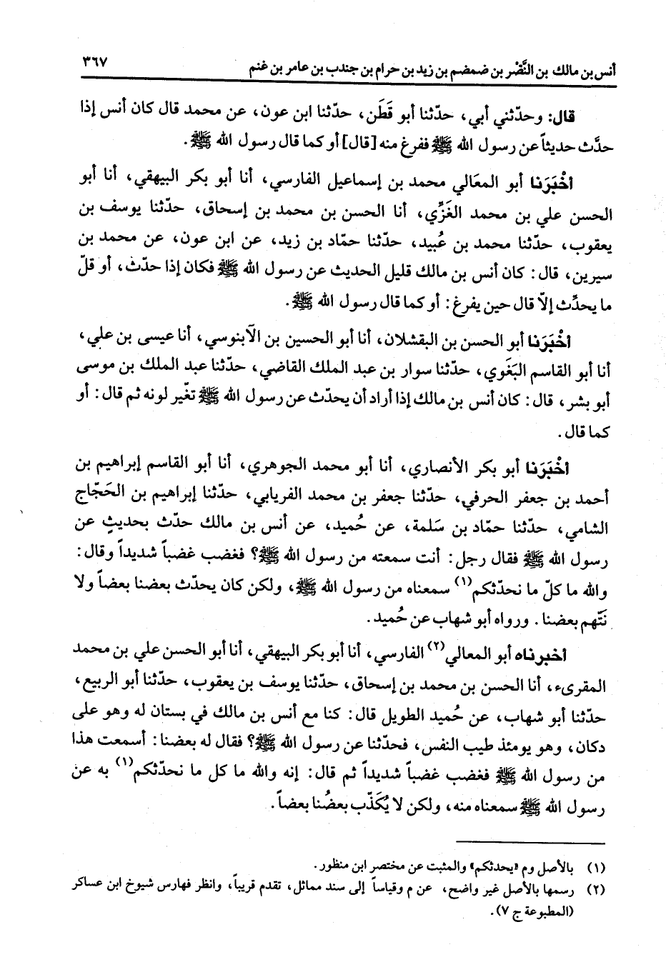قال وحدثني أبي حدثنا أبو قطن حدثنا ابن عون عن محمد قال كان أنس إذا حدث حديثا عن رسول الله (صلى الله عليه وسلم) ففرغ منه قال أو كما قال رسول الله (صلى الله عليه وسلم) أخبرنا أبو المعالي محمد بن إسماعيل الفارسي أنا أبو بكر البيهقي أنا أبو الحسن علي بن محمد الغزي أنا الحسن بن محمد بن إسحاق حدثنا يوسف بن يعقوب حدثنا محمد بن عبيد حدثنا حماد بن زيد عن ابن عون عن محمد بن سيرين قال كان أنس بن مالك قليل الحديث عن رسول الله (صلى الله عليه وسلم) فكان إذا حدث أو قل ما يحدث إلا قال حين يفرغ أو كما قال رسول الله (صلى الله عليه وسلم) أخبرنا أبو الحسن بن البقشلان أنا أبو الحسين بن الآبنوسي أنا عيسى بن علي أنا أبو القاسم البغوي حدثنا سوار بن عبد الملك القاضي حدثنا عبد الملك بن موسى أبو بشر قال كان أنس بن مالك إذا أراد أن يحدث عن رسول الله (صلى الله عليه وسلم) تغير لونه ثم قال أو كما قال أخبرنا أبو بكر الأنصاري أنا أبو محمد الجوهري أنا أبو القاسم إبراهيم بن أحمد بن جعفر الحرفي حدثنا جعفر بن محمد الفريابي حدثنا إبراهيم بن الحجاج الشامي حدثنا حماد بن سلمة عن حميد عن أنس بن مالك حدث بحديث عن رسول الله (صلى الله عليه وسلم) فقال رجل أنت سمعته من رسول الله (صلى الله عليه وسلم) فغضب غضبا شديدا وقال والله ما كل ما نحدثكم (1) سمعناه من رسول الله (صلى الله عليه وسلم) ولكن كان يحدث بعضنا بعضا ولا نتهم بعضنا ورواه أبو شهاب عن حميد أخبرناه أبو المعالي (2) الفارسي أنا أبو بكر البيهقي أنا أبو الحسن علي بن محمد المقرئ أنا الحسن بن محمد بن إسحاق حدثنا يوسف بن يعقوب حدثنا أبو الربيع حدثنا أبو شهاب عن حميد الطويل قال كنا مع أنس بن مالك في بستان له وهو على دكان وهو يومئذ طيب النفس فحدثنا عن رسول الله (صلى الله عليه وسلم) فقال له بعضنا أسمعت هذا من رسول الله (صلى الله عليه وسلم) فغضب غضبا شديدا ثم قال إنه والله ما كل ما نحدثكم (1) به عن رسول الله (صلى الله عليه وسلم) سمعناه منه ولكن لا يكذب بعضنا بعضا