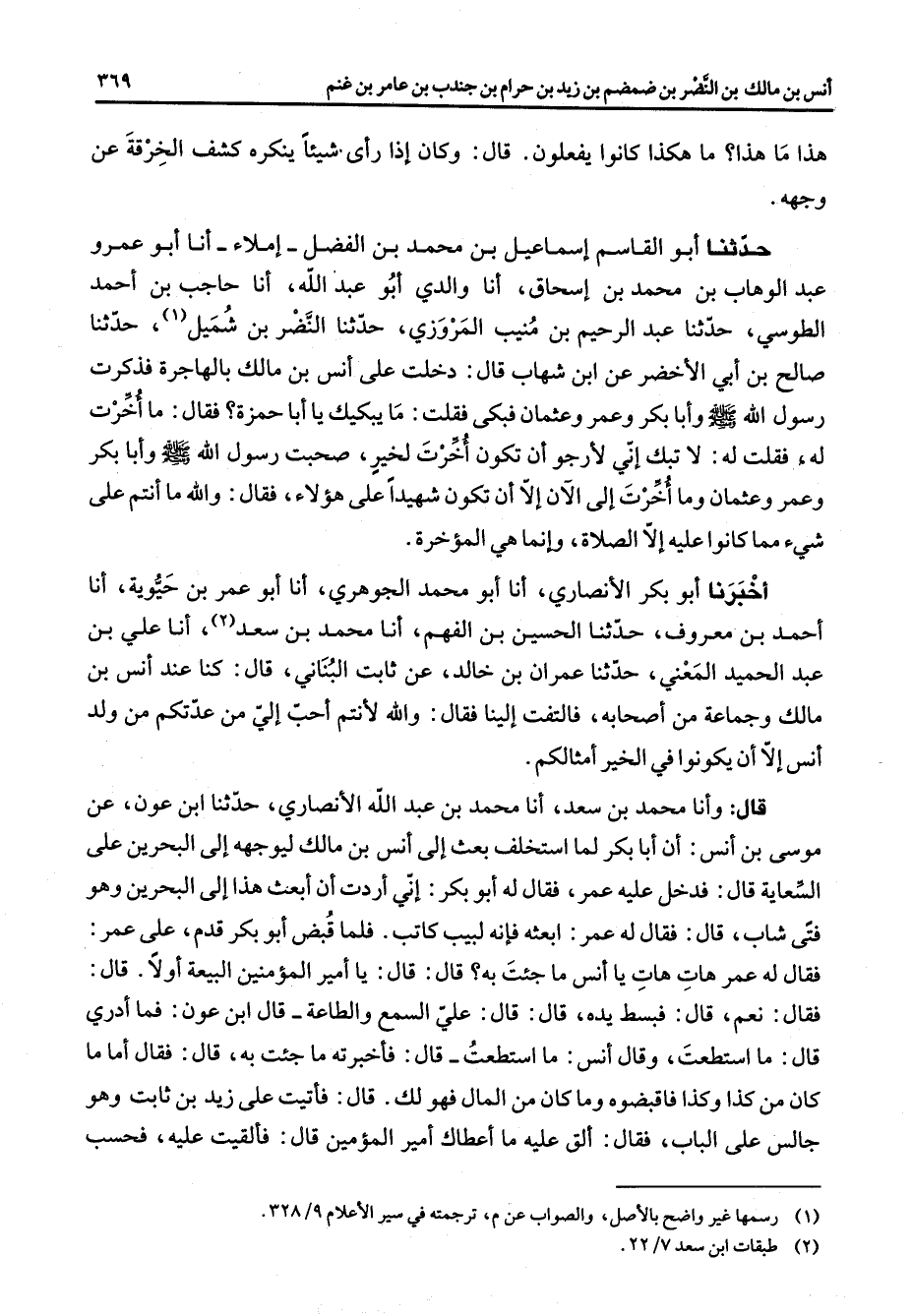 هذا ما هكذا كانوا يفعلون قال وكان إذا رأى شيئا ينكره كشف الخرقة عن وجهه حدثنا أبو القاسم إسماعيل بن محمد بن الفضل إملاء أنا أبو عمرو عبد الوهاب بن محمد بن إسحاق أنا والدي أبو عبد الله أنا حاجب بن أحمد الطوسي حدثنا عبد الرحيم بن منيب المروزي حدثنا النضر بن شميل (1) حدثنا صالح بن أبي الأخضر عن ابن شهاب قال دخلت على أنس بن مالك بالهاجرة فذكرت رسول الله (صلى الله عليه وسلم) وأبا بكر وعمر وعثمان فبكى فقلت ما يبكيك يا ابا حمزة فقال ما أخرت له فقلت له لا تبك إني لأرجو أن تكون أخرت لخير صحبت رسول الله (صلى الله عليه وسلم) وأبا بكر وعمر وعثمان وما أخرت إلى الآن إلا أن تكون شهيدا على هؤلاء فقال والله ما أنتم على شئ مما كانوا عليه إلا الصلاة وإنما هي المؤخرة أخبرنا أبو بكر الأنصاري أنا أبو محمد الجوهري أنا أبو عمر بن حيوية أنا أحمد بن معروف حدثنا الحسين بن الفهم أنا محمد بن سعد (2) أنا علي بن عبد الحميد المعني حدثنا عمران بن خالد عن ثابت البناني قال كنا عند أنس بن مالك وجماعة من أصحابه فالتفت إلينا فقال والله لأنتم أحب إلي من عدتكم من ولد أنس إلا أن يكونوا في الخير أمثالكم قال وأنا محمد بن سعد أنا محمد بن عبد الله الأنصاري حدثنا أبو عون عن موسى بن أنس أن أبا بكر لما استخلف بعث إلى أنس بن مالك ليوجهه إلى البحرين على السعاية قال فدخل عليه عمر فقال له أبو بكر إني أردت أن أبعث هذا إلى البحرين وهو فتى شاب قال فقال له عمر ابعثه فإنه لبيب كاتب فلما قبض أبو بكر قدم على عمر فقال له عمر هات هات يا أنس ما جئت به قال قال يا أمير المؤمنين البيعة أولا قال فقال نعم قال فبسط يده قال قال علي السمع والطاعة قال ابن عون فما أدري قال ما استطعت وقال أنس ما استطعت قال فأخبرته ما جئت به قال فقال أما ما كان من كذا وكذا فاقبضوه وما كان من المال فهو لك قال فأتيت على زيد بن ثابت وهو جالس على الباب فقال ألق عليه ما أعطاك أمير المؤمنين قال فألقيت عليه فحسب