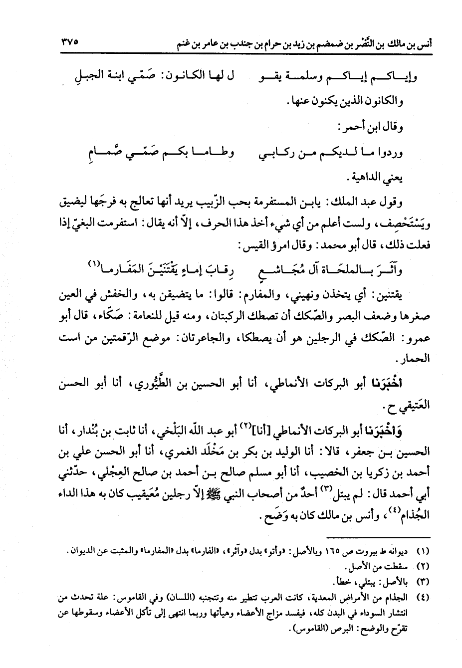 وأخبرنا أبو البركات الأنماطي أنا (2) أبو عبد الله البلخي أنا ثابت بن بندار أنا الحسين بن جعفر قالا أنا الوليد بن بكر بن مخلد الغمري أنا أبو الحسن علي بن أحمد بن زكريا بن الخصيب أنا أبو مسلم صالح بن أحمد بن صالح العجلي حدثني أبي أحمد قال لم يبتل (3) أحد من أصحاب النبي (صلى الله عليه وسلم) إلا رجلين معيقيب كان به هذا الداء الجذام وأنس بن مالك كان به وضح