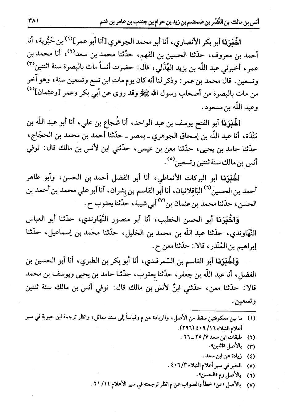 أخبرنا أبو بكر الأنصاري أنا أبو محمد الجوهري أنا أبو عمر بن حيوية أنا أحمد بن معروف حدثنا الحسين بن الفهم حدثنا محمد بن سعد أنا محمد بن عمر أخبرني عبد الله بن يزيد الهذلي قال حضرت أنسا مات بالبصرة سنة اثنتين وتسعين قال محمد بن عمر وذكر لنا أنه كان يوم مات ابن تسع وتسعين سنة وهو آخر من مات بالبصرة من أصحاب رسول الله (صلى الله عليه وسلم) وقد روى عن أبي بكر وعمر وعثمان وعبد الله بن مسعود أخبرنا أبو الفتح يوسف بن عبد الواحد أنا شجاع بن علي أنا أبو عبد الله بن مندة أنا عبد الله بن إسحاق الجوهري بمصر حدثنا أحمد بن محمد بن الحجاج حدثنا حامد بن يحيى حدثنا معن بن عيسى حدثني ابن لأنس بن مالك قال توفي أنس بن مالك سنة ثنتين وتسعين أخبرنا أبو البركات الأنماطي أنا أبو الفضل أحمد بن الحسن وأبو طاهر أحمد بن الحسين البقلانيان أنا أبو القاسم بن بشران أنا أبو علي محمد بن أحمد بن الحسن حدثنا محمد بن عثمان بن أبي شيبة حدثنا يعقوب ح وأخبرنا أبو الحسن الخطيب أنا أبو منصور النهاوندي حدثنا أبو العباس النهاوندي حدثنا عبد الله بن محمد بن الخليل حدثنا محمد بن إسماعيل حدثنا إبراهيم بن المنذر قالا حدثنا معن ح وأخبرنا أبو القاسم بن السمرقندي أنا أبو بكر بن الطبري أنا أبو الحسين بن الفضل أنا عبد الله بن جعفر حدثنا يعقوب حدثنا حامد بن يحيى ويوسف بن محمد قالا حدثنا معن حدثني ابن لأنس بن مالك قال توفي أنس بن مالك سنة ثنتين وتسعين