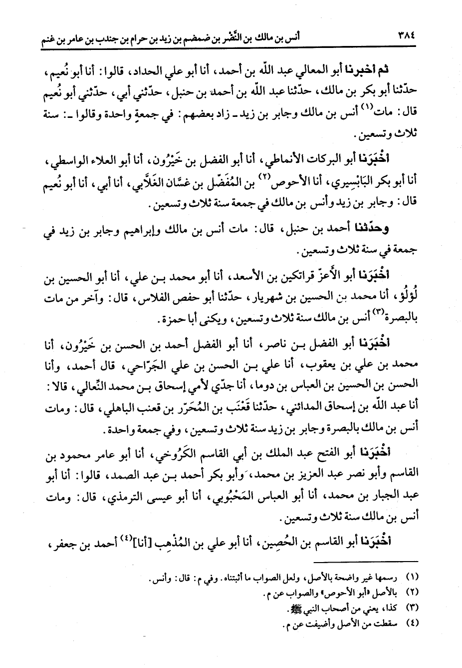 ثم أخبرنا أبو المعالي عبد الله بن أحمد أنا أبو علي الحداد قالوا أنا أبو نعيم حدثنا أبو بكر بن مالك حدثنا عبد الله بن أحمد بن حنبل حدثني أبي حدثني أبو نعيم قال مات (1) أنس بن مالك وجابر بن زيد زاد بعضهم في جمعة واحدة وقالوا سنة ثلاث وتسعين أخبرنا أبو البركات الأنماطي أنا أبو الفضل بن خيرون أنا أبو العلاء الواسطي أنا أبو بكر البابسيري أنا الأحوص (2) بن المفضل بن غسان الغلابي أنا أبي أنا أبو نعيم قال وجابر بن زيد وأنس بن مالك في جمعة سنة ثلاث وتسعين وحدثنا أحمد بن حنبل قال مات أنس بن مالك وإبراهيم وجابر بن زيد في جمعة في سنة ثلاث وتسعين أخبرنا أبو الأعز قراتكين بن الأسعد أنا أبو محمد بن علي أنا أبو الحسين بن لؤلؤ أنا محمد بن الحسين بن شهريار حدثنا أبو حفص الفلاس قال وآخر من مات بالبصرة (3) أنس بن مالك سنة ثلاث وتسعين ويكنى أبا حمزة أخبرنا أبو الفضل بن ناصر أنا أبو الفضل أحمد بن الحسن بن خيرون أنا محمد بن علي بن يعقوب أنا علي بن الحسن بن علي الجراحي قال أحمد وأنا الحسن بن الحسين بن العباس بن دوما أنا جدي لأمي إسحاق بن محمد النعالي قالا أنا عبد الله بن إسحاق المدائني حدثنا قعنب بن المحرر بن قعنب الباهلي قال ومات أنس بن مالك بالبصرة وجابر بن زيد سنة ثلاث وتسعين وفي جمعة واحدة أخبرنا أبو الفتح عبد الملك بن أبي القاسم الكروخي أنا أبو عامر محمود بن القاسم وأبو نصر عبد العزيز بن محمد وأبو بكر أحمد بن عبد الصمد قالوا أنا أبو عبد الجبار بن محمد أنا أبو العباس المحبوبي أنا أبو عيسى الترمذي قال ومات أنس بن مالك سنة ثلاث وتسعين أخبرنا أبو القاسم بن الحصين أنا أبو علي بن المذهب أنا (4) أحمد بن جعفر
