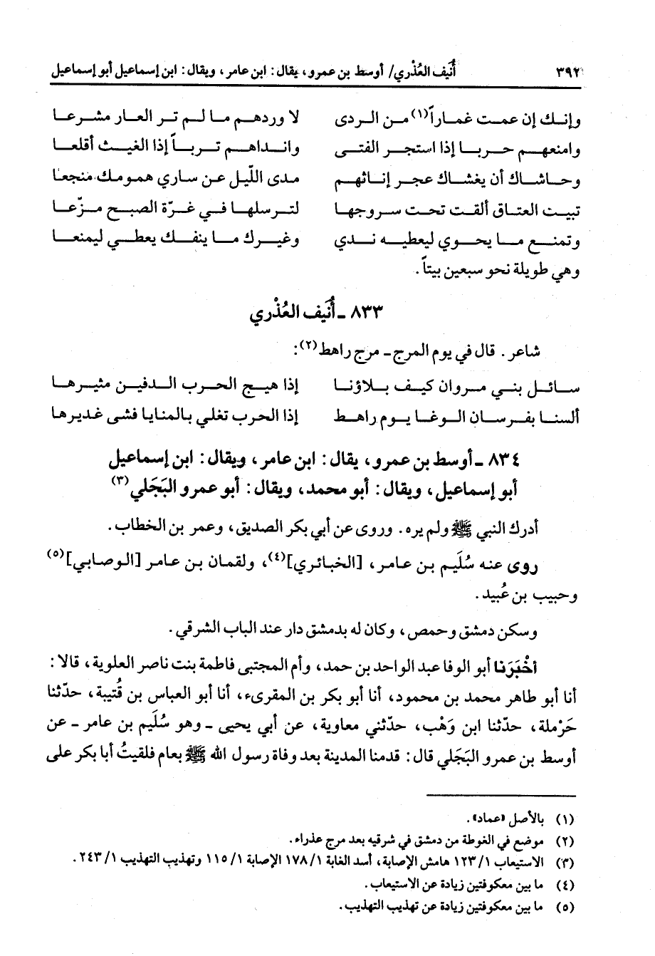 833 - أنيف العذري شاعر قال في يوم المرج مرج راهط (2) * سائل بني مروان كيف بلاؤنا * إذا هيج الحرب الدفين مثيرها ألسنا بفرسان الوغا يوم راهط * إذا الحرب تغلي بالمنايا فشى غديرها *