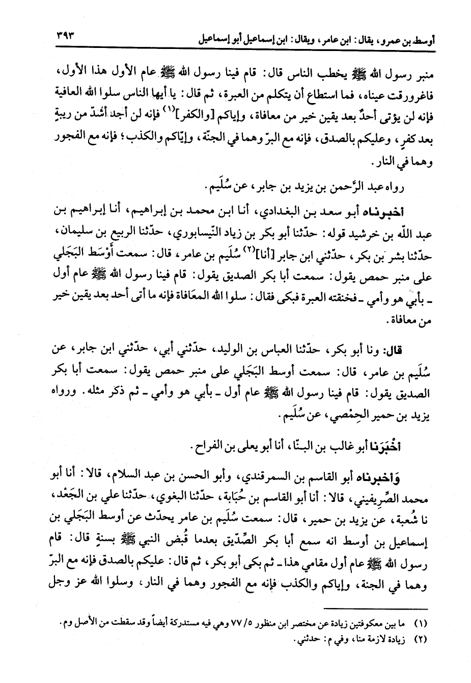 منبر رسول الله (صلى الله عليه وسلم) يخطب الناس قال قام فينا رسول الله (صلى الله عليه وسلم) عام الأول هذا الأول فاغرورقت عيناه فما استطاع أن يتكلم من العبرة ثم قال يا أيها الناس سلوا الله العافية فإنه لن يؤتى أحد بعد يقين خير من معافاة وإياكم والكفر (1) فإنه لن أجد أشد من ريبة بعد كفر وعليكم بالصدق فإنه مع البر وهما في الجنة وإياكم والكذب فإنه مع الفجور وهما في النار رواه عبد الرحمن بن يزيد بن جابر عن سليم أخبرناه أبو سعد بن البغدادي أنا ابن محمد بن إبراهيم أنا إبراهيم بن عبد الله بن خرشيد قوله حدثنا أبو بكر بن زياد النيسابوري حدثنا الربيع بن سليمان حدثنا بشر بن بكر حدثني ابن جابر أنا (2) سليم بن عامر قال سمعت أوسط البجلي على منبر حمص يقول سمعت أبا بكر الصديق يقول قام فينا رسول الله (صلى الله عليه وسلم) عام أول بأبي هو وأمي فخنقته العبرة فبكى فقال سلوا الله المعافاة فإنه ما أتى أحد بعد يقين خير من معافاة قال ونا أبو بكر حدثنا العباس بن الوليد حدثني أبي حدثني ابن جابر عن سليم بن عامر قال سمعت أوسط البجلي على منبر حمص يقول سمعت أبا بكر الصديق يقول قام فينا رسول الله (صلى الله عليه وسلم) عام أول بأبي هو وأمي ثم ذكر مثله ورواه يزيد بن حمير الحمصي عن سليم أخبرنا أبو غالب بن البنا أنا أبو يعلى بن الفراح وأخبرناه أبو القاسم بن السمرقندي وأبو الحسن بن عبد السلام قالا أنا أبو محمد الصريفيني قالا أنا أبو القاسم بن حبابة حدثنا البغوي حدثنا علي بن الجعد نا شعبة عن يزيد بن حمير قال سمعت سليم بن عامر يحدث عن أوسط البجلي بن إسماعيل بن أوسط أنه سمع أبا بكر الصديق بعدما قبض النبي (صلى الله عليه وسلم) بسنة قال قام رسول الله (صلى الله عليه وسلم) عام أول مقامي هذا ثم بكى أبو بكر ثم قال عليكم بالصدق فإنه مع البر وهما في الجنة وإياكم والكذب فإنه مع الفجور وهما في النار وسلوا الله عز وجل
