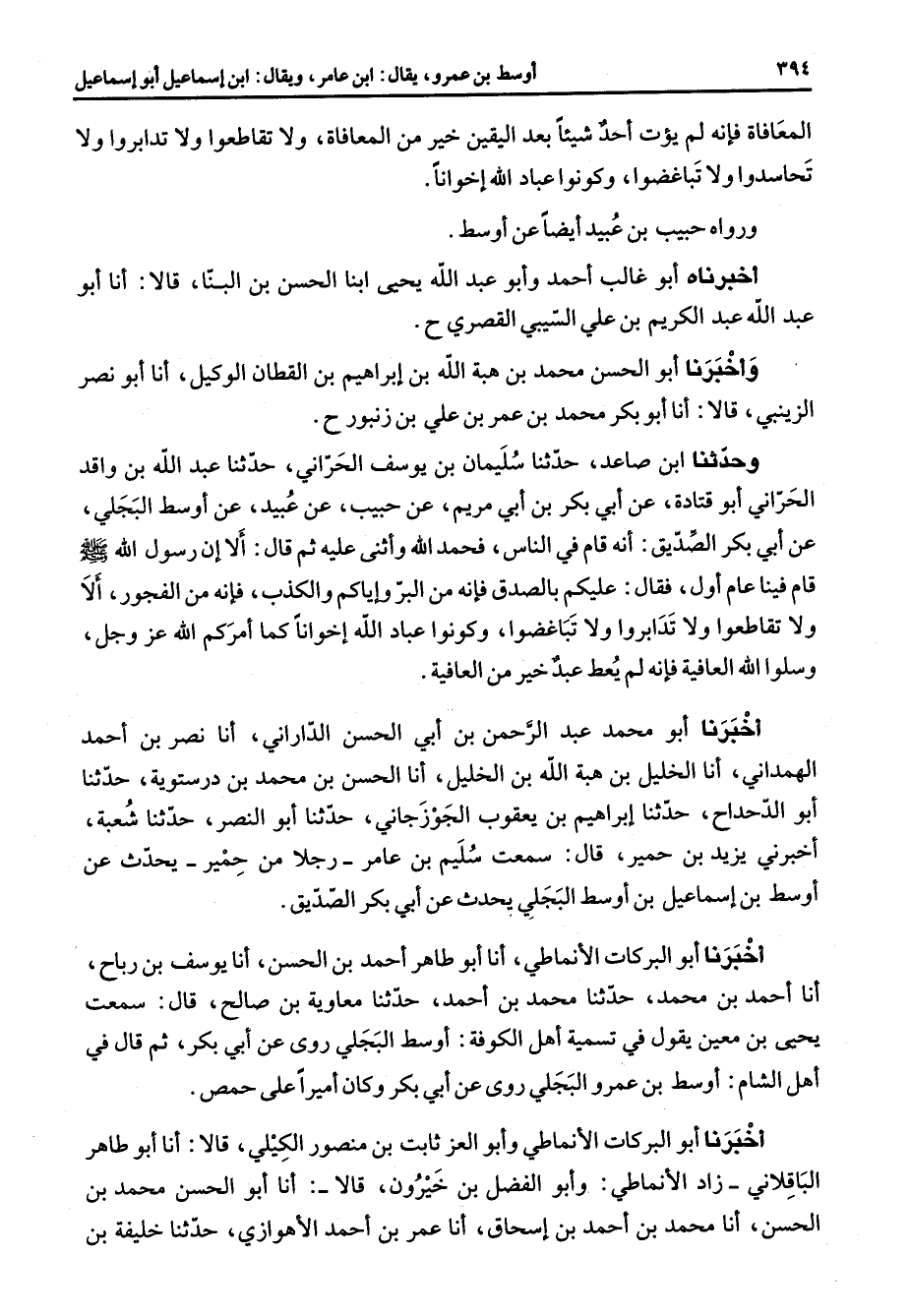 المعافاة فإنه لم يؤت أحد شيئا بعد اليقين خير من المعافاة ولا تقاطعوا ولا تدابروا ولا تحاسدوا ولا تباغضوا وكونوا عباد الله إخوانا ورواه حبيب بن عبيد أيضا عن أوسط أخبرناه أبو غالب أحمد وأبو عبد الله يحيى ابنا الحسن بن البنا قالا أنا أبو عبد الله عبد الكريم بن علي السيبي القصري ح وأخبرناه أبو الحسن محمد بن هبة الله بن إبراهيم بن القطان الوكيل أنا أبو نصر الزينبي قالا أنا أبو بكر محمد بن عمر بن علي بن زنبور ح وحدثنا ابن صاعد حدثنا سليمان بن يوسف الحراني حدثنا عبد الله بن واقد الحراني أبو قتادة عن أبي بكر بن أبي مريم عن حبيب عن عبيد عن أوسط البجلي عن أبي بكر الصديق أنه قام في الناس فحمد الله وأثنى عليه ثم قال ألا إن رسول الله (صلى الله عليه وسلم) قام فينا عام أول فقال عليكم بالصدق فإنه من البر وإياكم والكذب فإنه من الفجور ألا ولا تقاطعوا ولا تدابروا ولا تباغضوا وكونوا عباد الله إخوانا كما أمركم الله عز وجل وسلوا الله العافية فإنه لم يعط عبد خير من العافية أخبرنا أبو محمد عبد الرحمن بن أبي الحسن الداراني أنا نصر بن أحمد الهمداني أنا الخليل بن هبة الله بن الخليل أنا الحسن بن محمد بن درستوية حدثنا أبو الدحداح حدثنا إبراهيم بن يعقوب الجوزجاني حدثنا أبو النصر حدثنا شعبة أخبرني يزيد بن حمير قال سمعت سليم بن عامر رجلا من حمير يحدث عن أوسط بن إسماعيل بن أوسط البجلي يحدث عن أبي بكر الصديق أخبرنا أبو البركات الأنماطي أنا طاهر احمد بن الحسن أنا يوسف بن رباح أنا أحمد بن محمد حدثنا محمد بن أحمد حدثنا معاوية بن صالح قال سمعت يحيى بن معين يقول في تسمية أهل الكوفة أوسط البجلي روى عن أبي بكر ثم قال في أهل الشام أوسط بن عمرو البجلي روى عن أبي بكر وكان أميرا على حمص أخبرنا أبو البركات الأنماطي وأبو العز ثابت بن منصور الكيلي قالا أنا أبو طاهر الباقلاني زاد الأنماطي وأبو الفضل بن خيرون قالا أنا أبو الحسن محمد بن الحسن أنا محمد بن أحمد بن إسحاق أنا عمر بن أحمد الأهوازي حدثنا خليفة بن