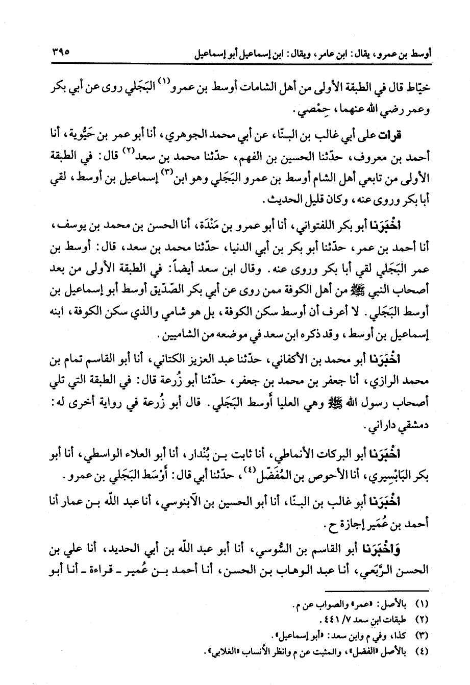خياط قال في الطبقة الأولى من أهل الشامات أوسط بن عمرو (1) البجلي روى عن أبي بكر وعمر Bهما حمصي قرأت على أبي غالب بن البنا عن أبي محمد الجوهري أنا أبو عمر بن حيوية أنا أحمد بن معروف حدثنا الحسين بن الفهم حدثنا محمد بن سعد (2) قال في الطبقة الأولى من تابعي أهل الشام اوسط بن عمرو البجلي وهو ابن (3) إسماعيل بن أوسط لقي أبا بكر روى عنه وكان قليل الحديث أخبرنا أبو بكر اللفتواني أنا أبو عمرو بن مندة أنا الحسن بن محمد بن يوسف أنا أحمد بن عمر حدثنا أبو بكر بن أبي الدنيا حدثنا محمد بن سعد قال أوسط بن عمر البجلي لقي أبا بكر وروى عنه وقال ابن سعد أيضا في الطبقة الأولى من بعد أصحاب النبي (صلى الله عليه وسلم) من أهل الكوفة ممن روى عن أبي بكر الصديق أوسط أبو إسماعيل بن أوسط البجلي لا أعرف أن أوسط سكن الكوفة بل هو شامي والذي سكن الكوفة ابنه إسماعيل بن أوسط وقد ذكره ابن سعد في موضعه من الشاميين أخبرنا أبو محمد بن الأكفاني حدثنا عبد العزيز الكتاني أنا أبو القاسم تمام بن محمد الرازي أنا جعفر بن محمد بن جعفر حدثنا أبو زرعة قال في الطبقة التي تلي أصحاب رسول الله (صلى الله عليه وسلم) وهي العليا أوسط البجلي قال أبو زرعة في رواية أخرى له دمشقي داراني أخبرنا أبو البركات الأنماطي أنا ثابت بن بندار أنا أبو العلاء الواسطي أنا أبو بكر البابسيري أنا الأحوص بن المفضل (4) حدثنا أبي قال أوسط البجلي بن عمرو أخبرنا أبو غالب بن البنا أنا أبو الحسين بن الآبنوسي أنا عبد الله بن عمار أنا أحمد بن عمير إجازة وأخبرنا أبو القاسم بن السوسي أنا أبو عبد الله بن أبي الحديد أنا علي بن الحسن الربعي أنا عبد الوهاب بن الحسن أنا أحمد بن عمير قراءة أنا أبو