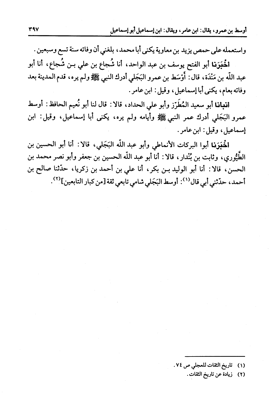 واستعمله على حمص يزيد بن معاوية يكنى أبا محمد بلغني أن وفاته سنة تسع وسبعين أخبرنا أبو الفتح يوسف بن عبد الواحد أنا شجاع بن علي بن شجاع أنا أبو عبد الله بن مندة قال أوسط بن عمرو البجلي أدرك النبي (صلى الله عليه وسلم) ولم يره قدم المدينة بعد وفاته بعام يكنى أبا إسماعيل وقيل ابن عامر أنبأنا أبو سعيد المطرز وأبو علي الحداد قالا قال لنا أبو نعيم الحافظ أوسط عمرو البجلي أدرك عمر النبي (صلى الله عليه وسلم) وأيامه ولم يره يكنى أبا إسماعيل وقيل ابن إسماعيل وقيل ابن عامر أخبرنا أبو البركات الأنماطي وأبو عبد الله البجلي قالا أنا أبو الحسين بن الطيوري وثابت بن بندار قالا أنا أبو عبد الله الحسين بن جعفر وأبو نصر محمد بن الحسن قالا أنا أبو الوليد بن بكر أنا علي بن أحمد بن زكريا حدثنا صالح بن أحمد حدثني أبي قال (1) أوسط البجلي شامي تابعي ثقة من كبار التابعين " (2)