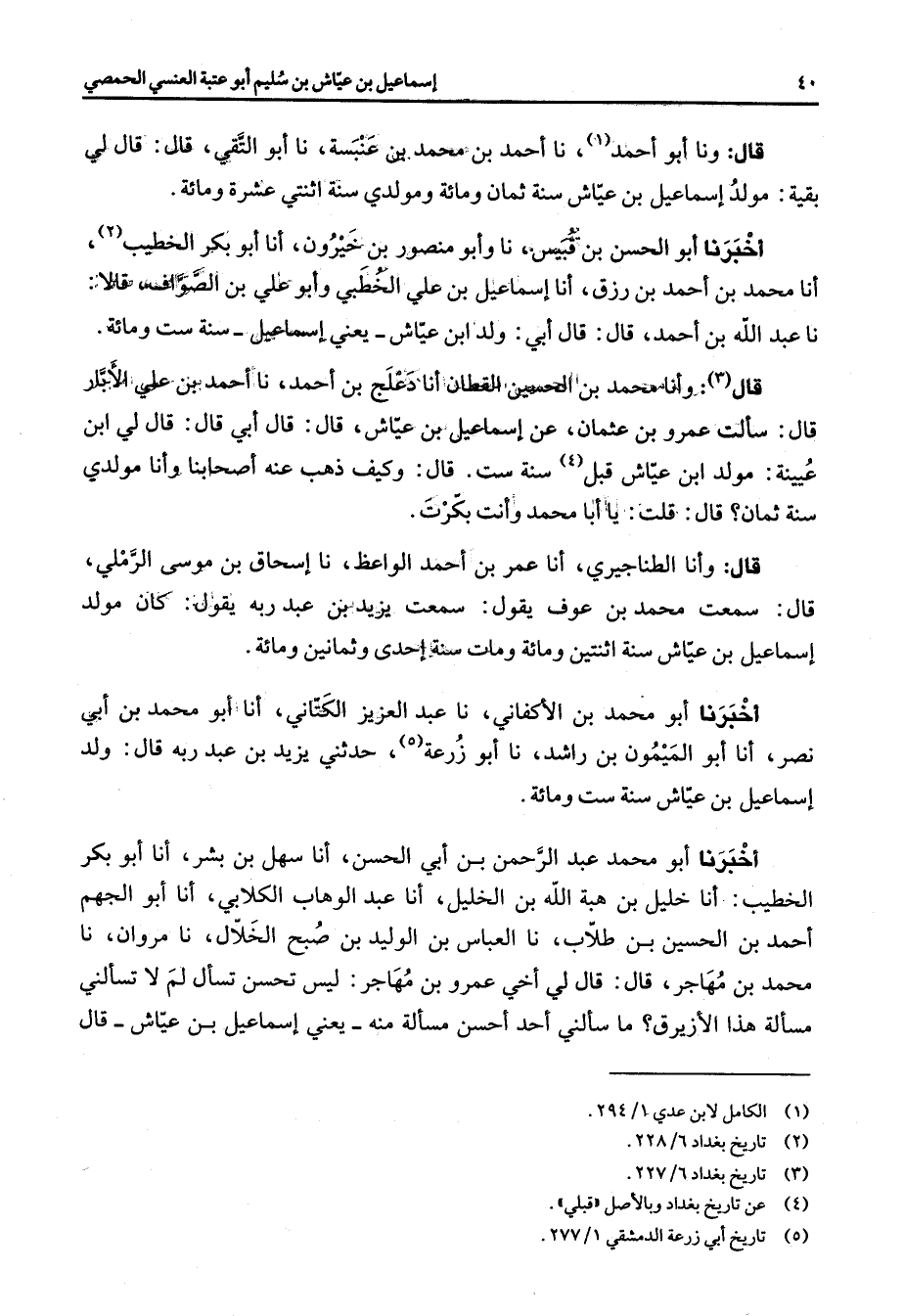 قال ونا أبو أحمد (1) نا أحمد بن محمد بن عنبسة نا أبو التقى قال قال لي بقية مولد إسماعيل بن عياش سنة ثمان ومائة ومولدي سنة اثنتي عشرة ومائة أخبرنا أبو الحسن بن قبيس نا وأبو منصور بن خيرون أنا أبو بكر الخطيب (2) أنا محمد بن أحمد رزق أنا إسماعيل بن علي الخطبي وأبو علي بن الصواف قالا نا عبد الله بن أحمد قال قال أبي ولد ابن عياش يعني إسماعيل سنة ست ومائة قال (3) وأنا محمد بن الحسين القطان أنا دعلج بن أحمد نا أحمد بن علي الأبار قال سألت عمرو بن عثمان عن إسماعيل بن عياش قال قال أبي قال قال لي ابن عيينة مولد ابن عياش قبل (4) سنة ست قال وكيف ذهب عنه أصحابنا وأنا مولدي سنة ثمان قال قلت يا أبا محمد وأنت بكرت قال وأنا الطناجيري أنا عمر بن أحمد الواعظ نا إسحاق بن موسى الرملي قال سمعت محمد بن عوف يقول سمعت يزيد بن عبد ربه يقول كان مولد إسماعيل بن عياش سنة اثنتين ومائة ومات سنة إحدى وثمانين ومائة أخبرنا أبو محمد بن الأكفاني نا عبد العزيز الكتاني أنا أبو محمد بن أبي نصر أنا أبو الميمون بن راشد نا أبو زرعة حدثني يزيد بن عبد ربه قال ولد إسماعيل بن عياش سنة ست ومائة أخبرنا أبو محمد عبد الرحمن بن أبي الحسن أنا سهل بن بشر أنا أبو بكر الخطيب أنا خليل بن هبة الله بن الخليل أنا عبد الوهاب الكلابي أنا أبو الجهم أحمد بن الحسين بن طلاب نا العباس بن الوليد بن صبح الخلال نمروان نا محمد بن مهاجر قال قال لي أخي عمرو بن مهاجر ليس تحسن تسأل لم لا تسألني مسألة هذا الأزيرق ما سألني أحد أحسن مسألة منه يعني إسماعيل بن عياش قال