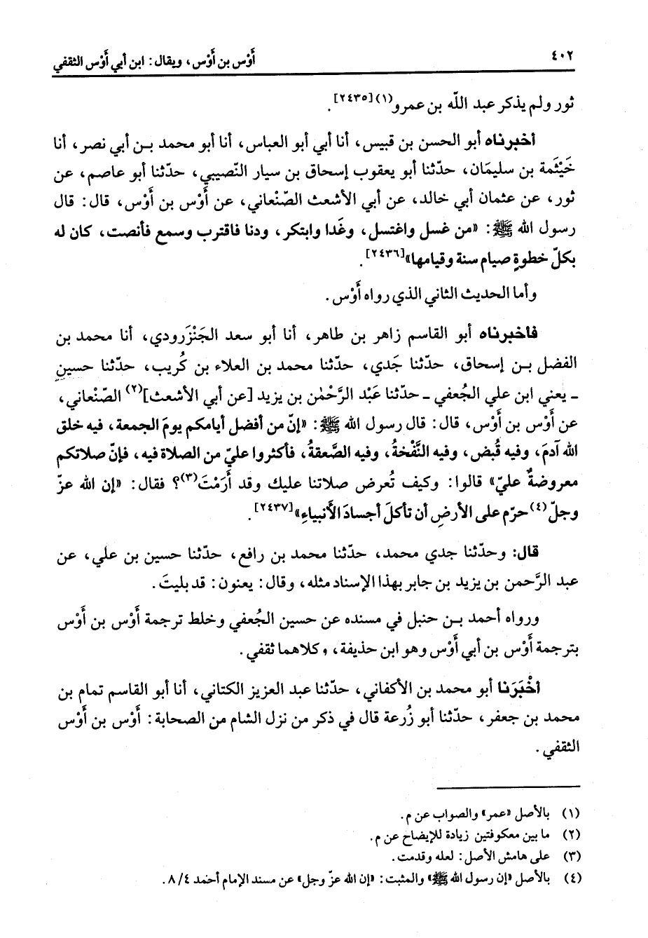 ثور ولم يذكر عبد الله بن عمرو (1) أخبرناه أبو الحسن بن قبيس أنا أبي أبو العباس أنا أبو محمد بن أبي نصر أنا خيثمة بن سليمان حدثنا أبو يعقوب إسحاق بن سيار النصيبي حدثنا أبو عاصم عن ثور عن عثمان أبي خالد عن أبي الأشعث الصنعاني عن أوس بن أوس قال قال رسول الله (صلى الله عليه وسلم) من غسل واغتسل وغدا وابتكر ودنا فاقترب وسمع فأنصت كان له بكل خطوة صيام سنة وقيامها وأما الحديث الثاني الذي رواه أوس فأخبرناه أبو القاسم زاهر بن طاهر أنا أبو سعد الجنزرودي أنا محمد بن الفضل بن إسحاق حدثنا جدي حدثنا محمد بن العلاء بن كريب حدثنا حسين يعني ابن علي الجعفي حدثنا عبد الرحمن بن يزيد عن أبي الأشعث (2) الصنعاني عن أوس بن أوس قال قال رسول الله (صلى الله عليه وسلم) إن من أفضل أيامكم يوم الجمعة فيه خلق الله آدم وفيه قبض وفيه النفخة وفيه الصعقة فأكثروا علي من الصلاة فيه فإن صلاتكم معروضة علي قالوا وكيف تعرض صلاتنا عليك وقد أرمت فقال إن الله عز وجل حرم على الأرض أن تأكل أجساد الأنبياء قال وحدثنا جدي محمد حدثنا محمد بن رافع حدثنا حسين بن علي عن عبد الرحمن بن يزيد بن جابر بهذا الإسناد مثله وقال يعنون قد بليت ورواه أحمد بن حنبل في مسنده عن حسين الجعفي وخلط ترجمة أوس بن أوس بترجمة أوس بن أبي أوس وهو ابن حذيفة وكلاهما ثقفي أخبرنا أبو محمد بن الأكفاني حدثنا عبد العزيز الكتاني أنا أبو القاسم تمام بن محمد بن جعفر حدثنا أبو زرعة قال في ذكر من نزل الشام من الصحابة أوس بن أوس الثقفي