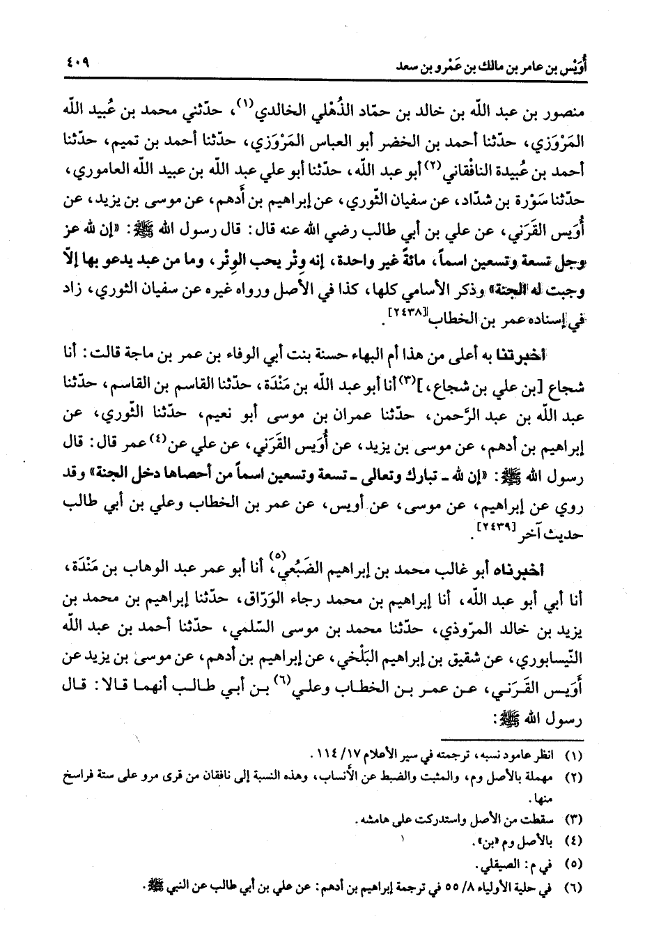 منصور بن عبد الله بن خالد بن حماد الذهلي الخالدي (1) حدثني محمد بن عبيد الله المروزي حدثنا أحمد بن الخضر أبو العباس المروزي حدثنا أحمد بن تميم حدثنا أحمد بن عبيدة النافقاني أبو عبد الله حدثنا أبو علي عبد الله بن عبيد الله العاموري حدثنا سورة بن شداد عن سفيان الثوري عن إبراهيم بن أدهم عن موسى بن يزيد عن أويس القرني عن علي بن أبي طالب Bهـ قال قال رسول الله (صلى الله عليه وسلم) إن لله عز وجل تسعة وتسعين اسما مائة غير واحدة إنه وتر يحب الوتر وما من عبد يدعو بها إلا وجبت له الجنة وذكر الأسامي كلها كذا في الأصل ورواه غيره عن سفيان الثوري زاد في إسناده عمر بن الخطاب اخبرتنا به أعلى من هذا أم البهاء حسنة بنت أبي الوفاء بن عمر بن ماجة قالت أنا شجاع بن علي بن شجاع (3) أنا أبو عبد الله بن مندة حدثنا القاسم بن القاسم حدثنا عبد الله بن عبد الرحمن حدثنا عمران بن موسى أبن نعيم حدثنا الثوري عن إبراهيم بن أدهم عن موسى بن يزيد عن أويس القرني عن علي عن (4) عمر قال قال رسول الله (صلى الله عليه وسلم) إن لله تبارك وتعالى تسعة وتسعين اسما من أحصاها دخل الجنة وقد روي عن إبراهيم عن موسى عن أويس عن عمر بن الخطاب وعلي بن أبي طالب حديث آخر أخبرناه أبو غالب محمد بن إبراهيم الضبعي (5) أنا أبو عمر عبد الوهاب بن مندة أنا أبي أبو عبد الله أنا إبراهيم بن محمد رجاء الوراق حدثنا إبراهيم بن محمد بن يزيد بن خالد المروذي حدثنا محمد بن موسى السلمي حدثنا أحمد بن عبد الله النيسابوري عن شقيق بن إبراهيم البلخي عن إبراهيم بن أدهم عن موسى بن يزيد عن أويس القرني عن عمر بن الخطاب وعلي (6) بن أبي طالب أنهما قالا قال رسول الله (صلى الله عليه وسلم)