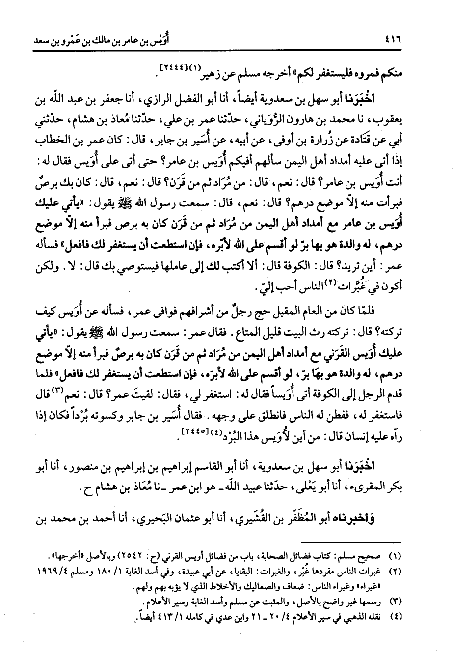 منكم فمروه فليستغفر لكم أخرجه مسلم عن زهير (1) أخبرنا أبو سهل بن سعدوية أيضا أنا أبو الفضل الرازي أنا جعفر بن عبد الله بن يعقوب نا محمد بن هارون الروياني حدثنا عمر بن علي حدثنا معاذ بن هشام حدثني أبي عن قتادة عن زرارة بن أوفى عن أبيه عن أسير بن جابر قال كان عمر بن الخطاب إذا أتى عليه أمداد أهل اليمن سألهم أفيكم أويس بن عامر حتى أتى على أويس فقال له أنت أويس بن عامر قال نعم قال من مراد ثم من قرن قال نعم قال كان بك برص فبرأت منه إلا موضع درهم قال نعم قال سمعت رسول الله (صلى الله عليه وسلم) يقول يأتي عليك أويس بن عامر مع أمداد أهل اليمن من مراد ثم من قرن كان به برص فبرأ منه إلا موضع درهم له والدة هو بها بر لو أقسم على الله لأبره فإن استطعت أن يستغفر لك فافعل فسأله عمر أين تريد قال الكوفة ألا أكتب لك إلى عاملها فيستوصي بك قال لا ولكن أكون في غبرات (2) الناس أحب إلي فلما كان من العام المقبل حج رجل من أشرافهم فوافى عمر فسأله عن أويس وكيف تركته قال تركته رث البيت قليل المتاع فقال عمر سمعت رسول الله (صلى الله عليه وسلم) يقول يأتي عليك أويس القرني مع أمداد أهل اليمن من مراد ثم من قرن كان به برص فبرأ منه إلا موضع درهم له والدة هو بها بر لو أقسم على الله لأبره فإن استطعت أن يستغفر لك فافعل فلما قدم الرجل إلى الكوفة أتى أويسا فقال له استغفر لي فقال لقيت عمر قال نعم (3) قال فاستغفر له ففطن له الناس فانطلق على وجهه فقال أسير بن جابر وكسوته بردا فكان إذا رآه عليه إنسان قال من أين لأويس هذا البرد (4) أخبرنا أبو سهل بن سعدوية أنا أبو القاسم إبراهيم بن إبراهيم بن منصور أنا أبو بكر المقرئ أنا أبو يعلى حدثني عبيد الله هو ابن عمر نا معاذ بن هشام وأخبرناه أبو المظفر بن القشيري أنا أبو عثمان البحيري أنا أحمد بن محمد بن