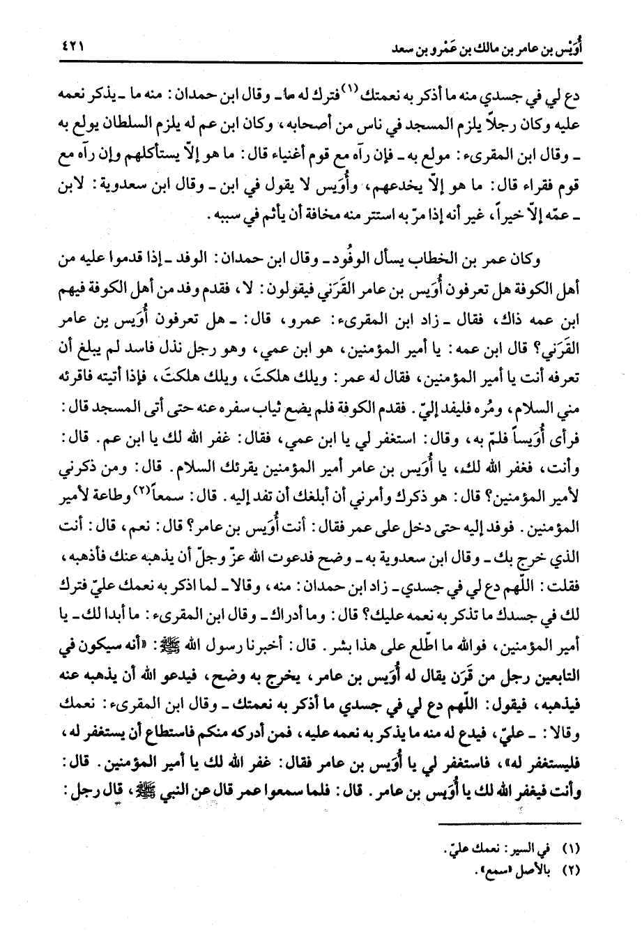 دع لي في جسدي منه ما أذكر به نعمتك (1) فترك له ما وقال ابن حمدان منه ما يذكر نعمه عليه وكان رجلا يلزم المسجد في ناس من أصحابه وكان ابن عم له يلزم السلطان يولع به وقال ابن المقرئ مولع به فإن رآه مع قوم أغنياء قال ما هو إلا يستأكلهم وإن رآه مع قوم فقراء قال ما هو إن يخدعهم وأويس لا يقول في ابن وقال ابن سعدوية لابن عمه إلا خيرا غير أنه إذا مر به استتر منه مخافة أن يأثم في سببه وكان عمر بن الخطاب يسأل الوفود وقال ابن حمدان الوفد إذا قدموا عليه من أهل الكوفة هل تعرفون أويس بن عامر القرني فيقولون فقدم وفد من أهل الكوفة فيهم ابن عمه ذاك فقال زاد ابن المقرئ عمرو قال هل تعرفون أويس بن عامر القرني قال ابن عمه يا أمير المؤمنين هو ابن عمي وهو رجل نذل فاسد لم يبلغ أن تعرفه أنت يا أمير المؤمنين فقال له عمر ويلك هلكت ويلك هلكت فإذا أتيته فاقرئه مني السلام ومره فليفد إلي فقدم الكوفة فلم يضع ثياب سفره عنه حتى أتى المسجد قال فرأى أويسا فلم به وقال استغفر لي يا ابن عمي فقال غفر الله لك يا ابن عم قال وأنت فغفر الله لك يا أويس بن عامر أمير المؤمنين يقرئك السلام قال ومن ذكرني لأمير المؤمنين قال هو ذكرك وأمرني أأبلغك أن تفد إليه قال سمعا (2) وطاعة لأمير المؤمنين فوفد إليه حتى دخل على عمر فقال أنت أويس بن عامر قال نعم قال أنت الذي خرج بك وقال ابن سعدوية به وضف دعوت الله عز وجل أن يذهبه عنك فأذهبه فقلت اللهم دع لي في جسدي زاد ابن حمدان منه وقالا لما اذكر به نعمك علي فترك لك في جسدك ما تذكر به نعمه عليك قال وما أدراك وقال ابن المقرئ ما أبدا لك يا أمير المؤمنين فوالله ما اطلع على هذا بشر قال أخبرنا رسول الله (صلى الله عليه وسلم) أنه سيكون في التابعين رجل من قرن يقال له أويس بن عامر يخرج به وضح فيدعو الله أن يذهبه عنه فيذهبه فيقول اللهم دع لي في جسدي ما أذكر به نعمك وقال ابن المقرئ نعمتك وقالا علي فيدع له منه ما يذكر به نعمه عليه فمن أدركه منكم فاستطاع أن يستغفر له فليستغفر له فاستغفر لي يا أويس بن عامر فقال غفر الله لك يا أمير المؤمنين قال وأنت فيغفر الله لك يا أويس بن عامر قال فلما سمعوا عمر قال عن النبي (صلى الله عليه وسلم) قال رجل